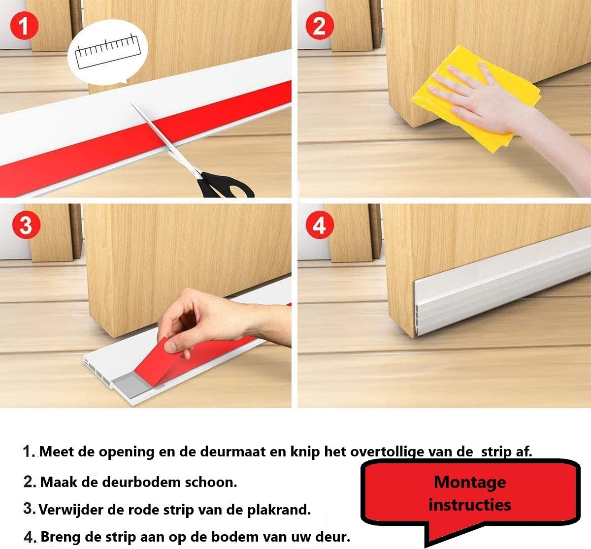 - Snelle montage: Maak je deur schoon voordat je deze strip aanbrengt. Meet vervolgens hoe lang je deur is, en markeer de lengte op de tochtstrip. Knip vervolgens de overbodige lengte af en verwijder de sticker op de achterkant. Plak de strip nu op je deur. En klaar is Kees.