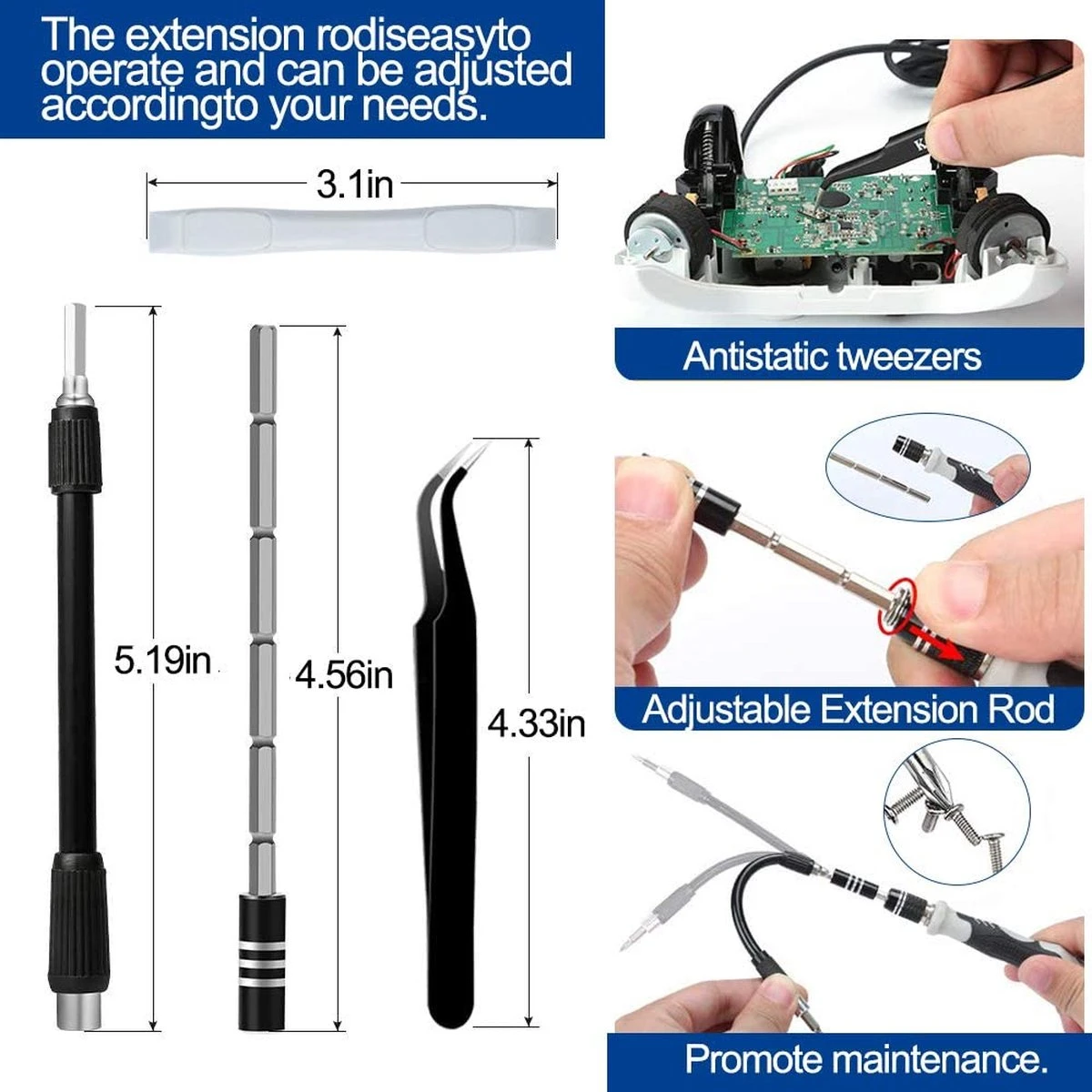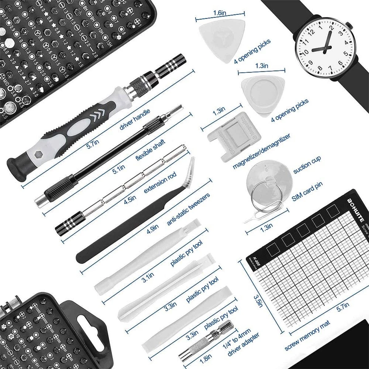 Het bevat alles wat je nodig hebt voor huishoudelijke apparaten, autoreparatie, repareren van laptops, smartphones, horloges en andere elektronische apparaten. De magnetische schroevendraaier kan worden gebruikt om de schroeven eruit te halen, zelfs als de schroef in de opening valt