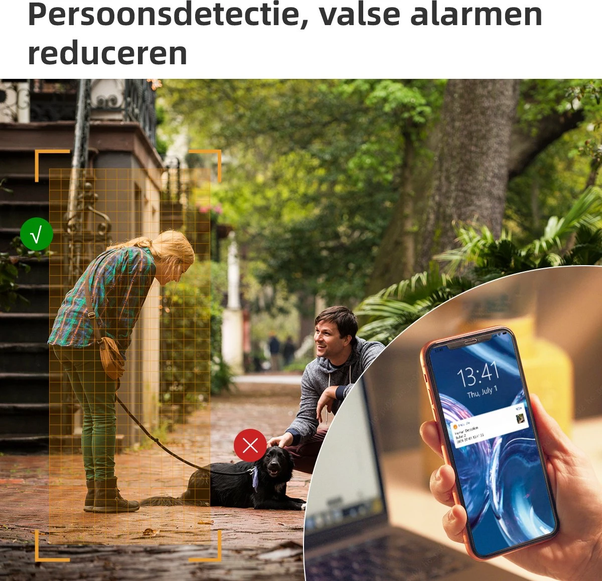 De Bullet 2 buitencamera identificeert nauwkeurig mensen met de AI-functie voor menselijke detectie, waardoor valse alarmen van bijvoorbeeld dieren of vallende bladeren worden voorkomen. Ervaar een handige manier van beveiligen met deze slimme buitencamera. Ook ’s nachts biedt deze camera goede beveiliging dankzij de 4 nachtzichtstanden;