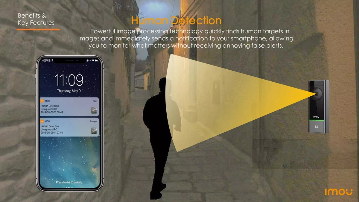De 5MP (QHD) lens biedt een geweldige beeldkwaliteit om bezoekers te begroeten en om de voorkant van het huis te bewaken, ook ’s nachts dankzij de nachtzichtmodus. De toegepaste H.265 beeldcompressietechniek zorgt ervoor dat hoogwaardige opnames en streams relatief weinig ruimte innemen en dus minder bandbreedte nodig hebben. Op deze manier kan de beschikbare opslagruimte en bandbreedte optimaal worden benut. De Imou DB60 videodeurbel maakt gebruik van 2,4 GHz wifi en biedt een prima stabiele verbinding in combinatie met de Chime die tevens een wifi-extender is.