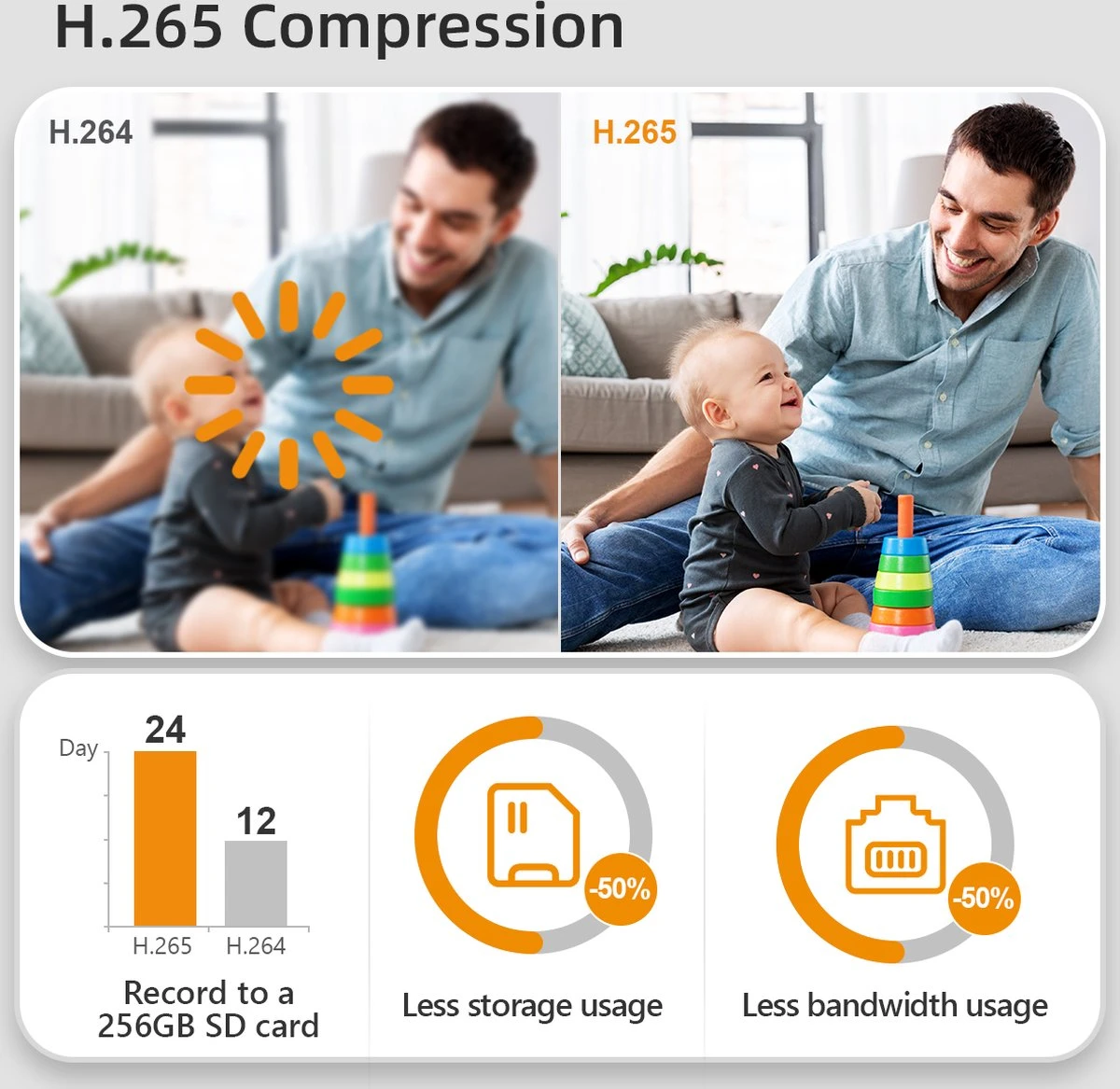 Dank zij de 4MP (QHD, 1440P) lens biedt de camera uitmuntende beeldkwaliteit met een resolutie van: 2560 x 1440. De H.265 beeldcompressie techniek die gebruikt wordt zorgt tegelijkertijd ervoor, dat hoge kwaliteit opnames en streams, relatief weinig ruimte in beslag nemen en dus minder bandbreedte vereisen. Zo kan de beschikbare opslagruimte en bandbreedte optimaal benut worden.