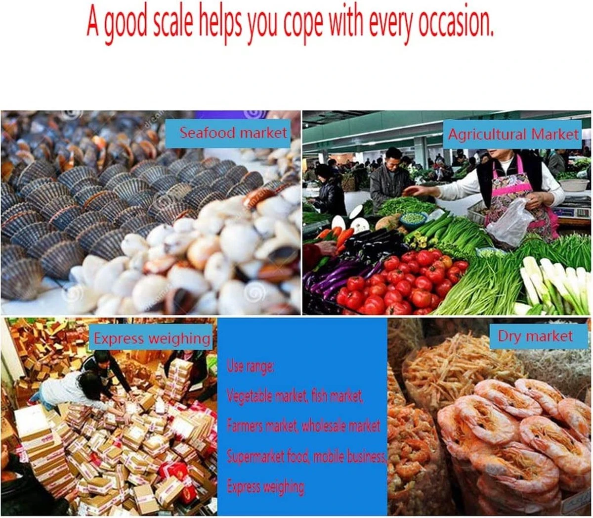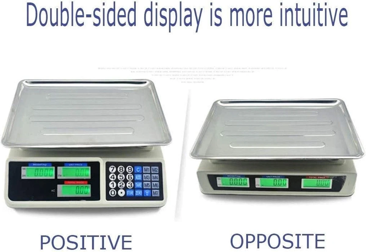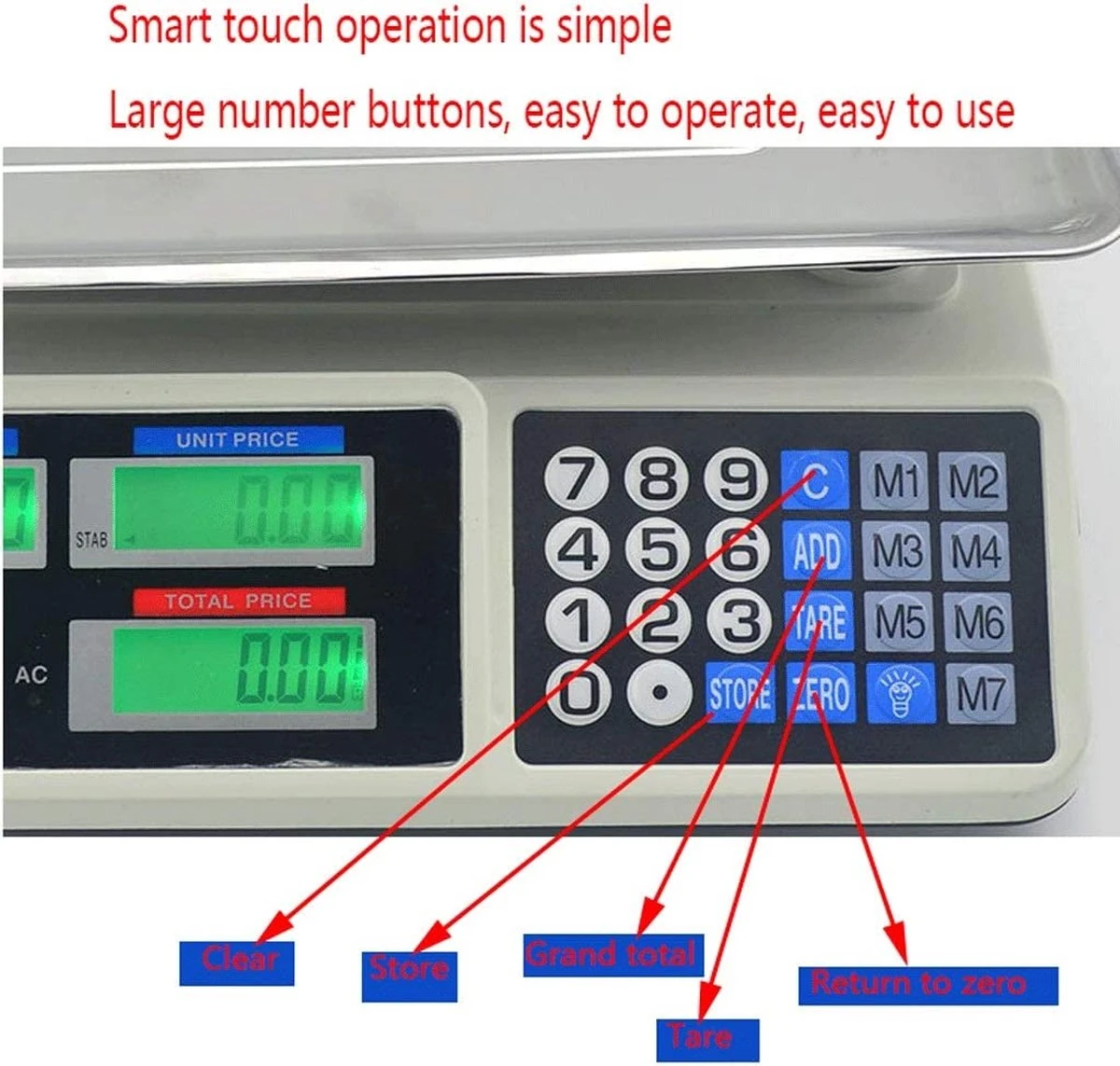 Voorzien van een netvoeding en een sterke ingebouwde accu van 4AH zodat de weegschaal makkelijk overal kan worden ingezet, de pootjes zijn verstelbaar, 7 voorkeuze geheugens voor product prijs en directe ingave mogelijkheid, weegt van 100 gram tot 40 KG in stappen van 5 gram, makkelijk schoon te maken roestvrij stalen schaal, met tarra functie, instelbare display verlichting, accu indicator, optel functie voor totaal prijs, schakelt automatisch uit en aan om stroom te besparen.