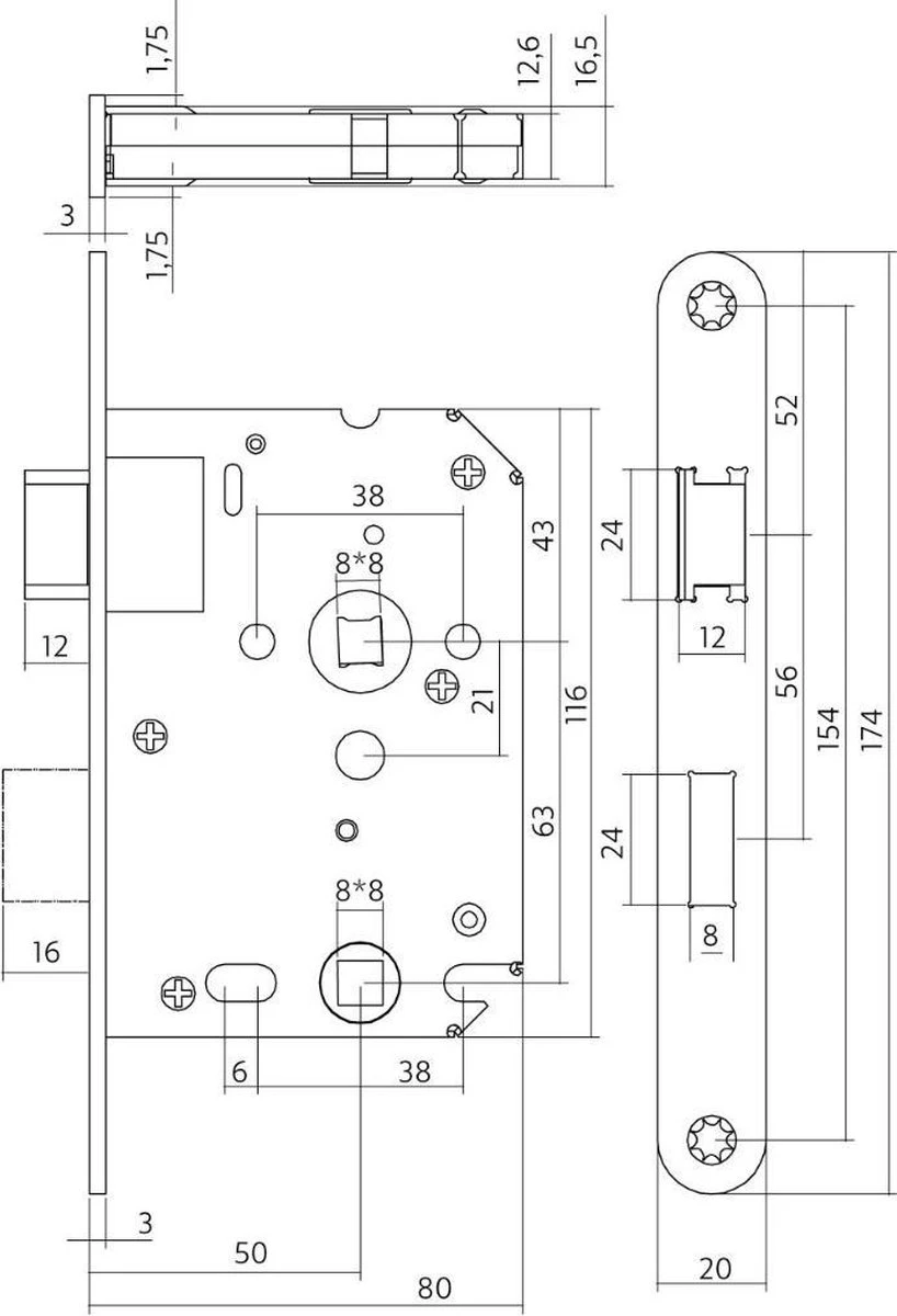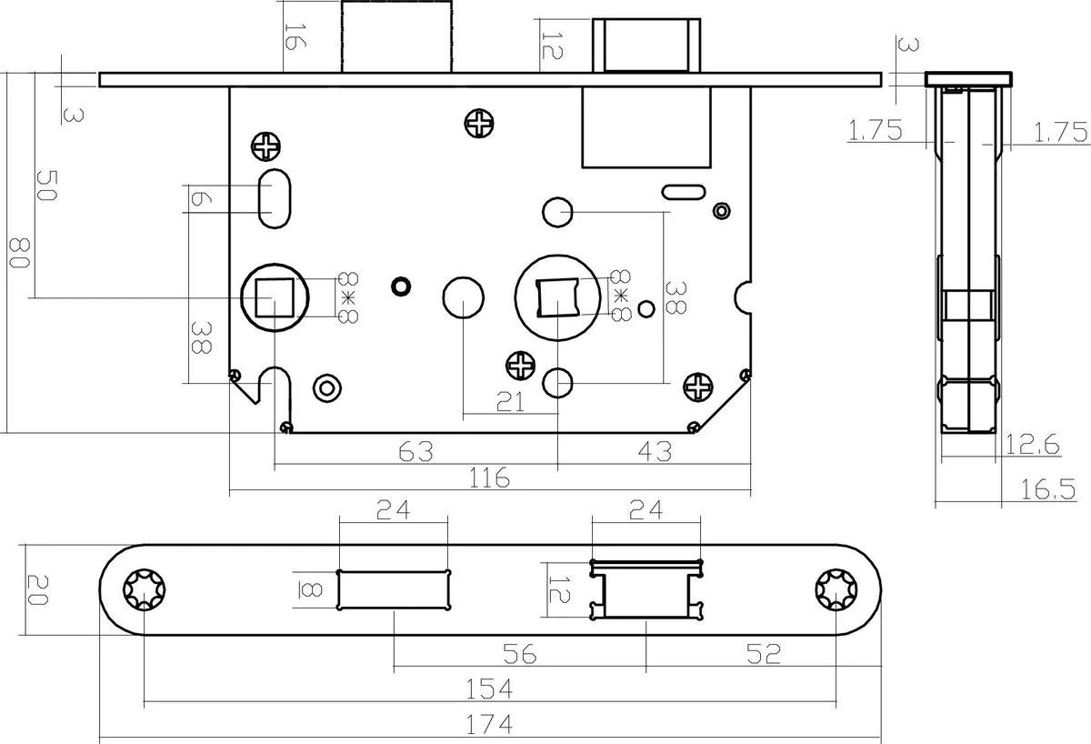 Dit slot wordt geleverd in toilet-/badkamer uitvoering op 63 mm met 8mm stift. De sloten van Intersteel en de bijbehorende sluitplaten zijn verkrijgbaar in diverse uitvoeringen en draairichtingen. De doornmaat van het slot is 50 mm en wordt geleverd inclusief sluitplaat en voorplaat. De witte voorplaat heeft een afmeting van 174 x 20 mm (hxb). U kunt dezelfde inbouw- en freesmaten gebruiken als een standaard woningslot. De dagschoot van dit slot is omwisselbaar; dat wil zeggen dat deze voor zowel een linksdraaiende deur als een rechtsdraaiende deur geschikt is.