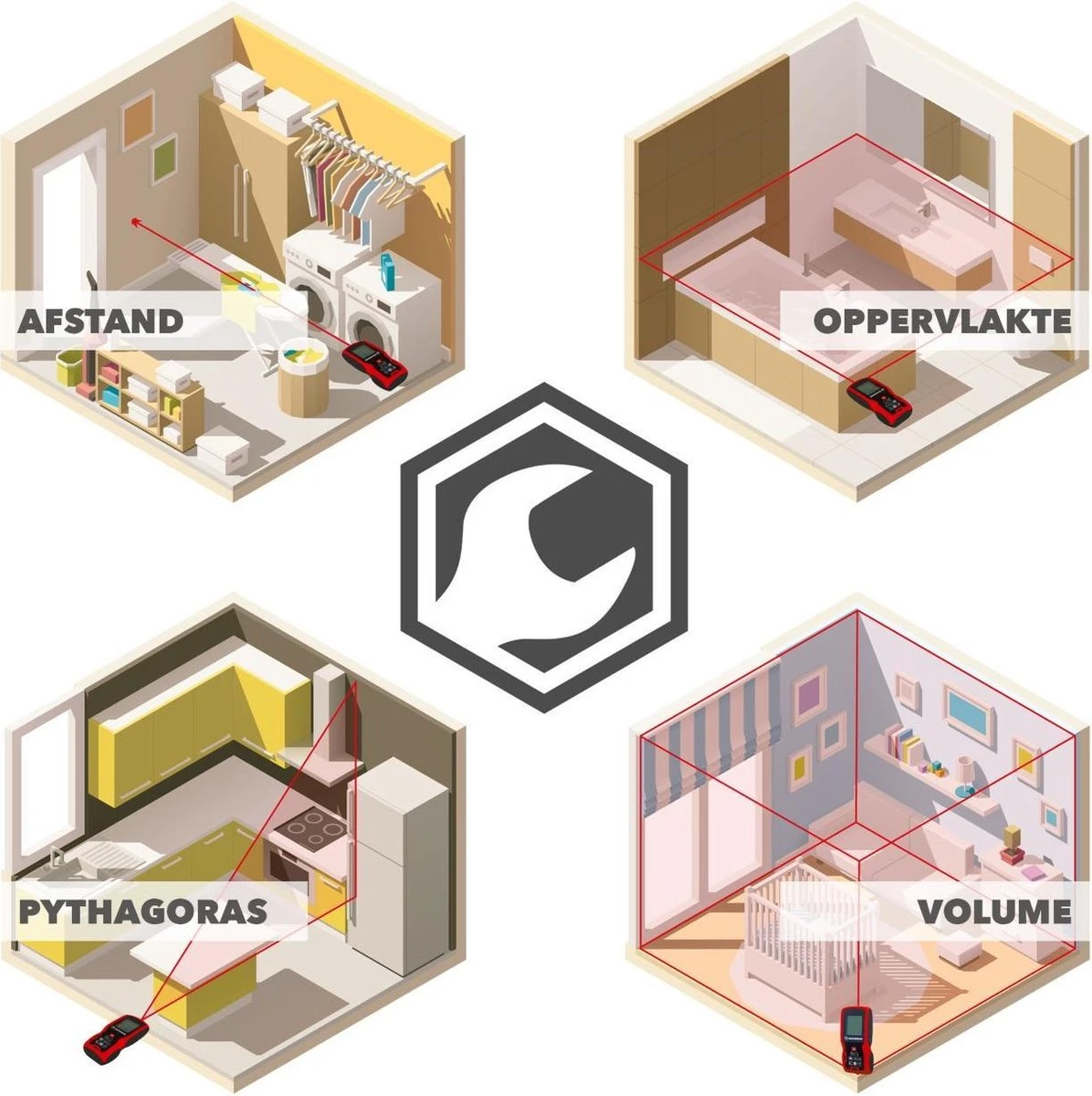 Gebruik de bidirectionele waterpas die zowel horizontaal als verticaal zorgt voor meetresultaten die tot op de 1,5mm accuraat zijn. Je hebt binnen 0,1-3 seconden de oppervlakte, het volume, de lengte of Pythagoras gemeten in een ruimte. Deze laserafstandsmeter kan tot wel 100 meter ver komen en is hierdoor uitermate geschikt voor grote en kleine projecten.