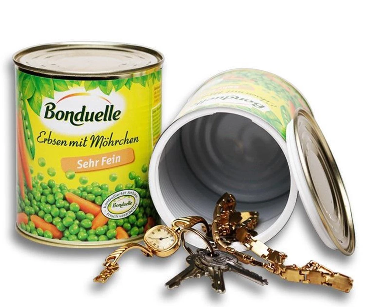 Waar bewaar ik mijn waardevolle bezittingen het veiligste? Deze vraag heeft ieder van ons zich al wel eens gesteld. Kunnen ze het niet vinden, dan kunnen ze het ook niet stelen! Dit blik is niet te ontdekken: Een echt blik en een origineel etiket. Vele toepassingen: Voor in de auto, caravan, camper, garage, werkplaats, keuken, op kantoor of in de hotel kamer. Het blik kan eenvoudig worden afgesloten met een slim aangebrachte schroefdop. Maat van het blik: Hoogte 12cm / Breedte 10cm. Groot genoeg voor uw sleutels, telefoon, sieraden, geld, enz. Uit het zicht, dus geen verleiding tot stelen. Hoge kwaliteit en 100% nieuw!