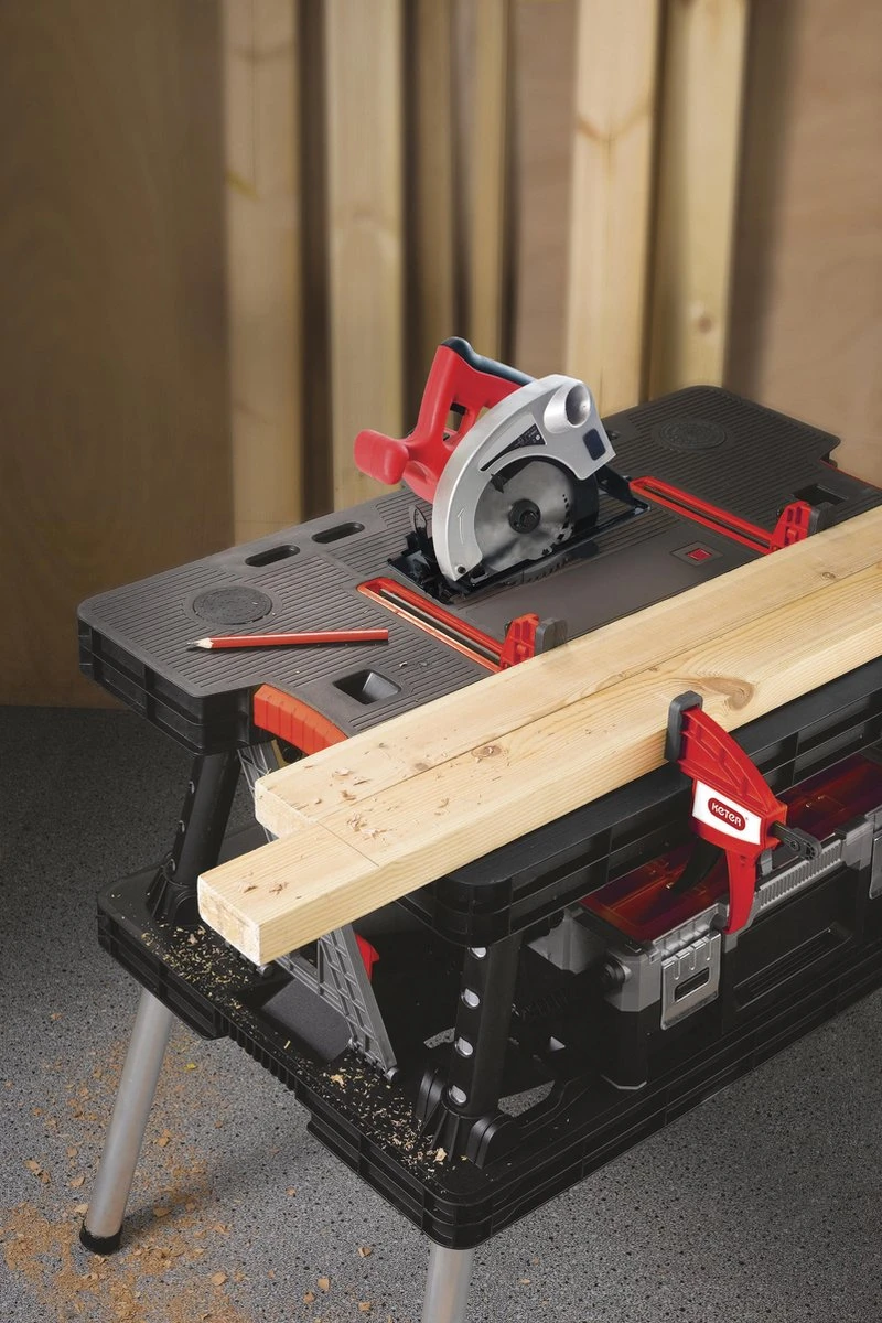 Deze Keter Inklapbare Werktafel is nog altijd populair. Een zeer veelzijdige werktafel is nu voorzien van extra functies. Hij heeft nog steeds een lichtgewicht frame zodat je hem gemakkelijk kunt opvouwen en dragen, en hij is stevig genoeg om een lading van 450 kg te dragen. Daarnaast is de tafel uitgerust met en knevel- en houdklemmen, zodat die balk die je wilt zagen stevig op de tafel blijft liggen! Het heeft een uniek opvouwbaar systeem waardoor het snel en eenvoudig is op te zetten en in te pakken. Kortom, de ideale basis voor elke klus!