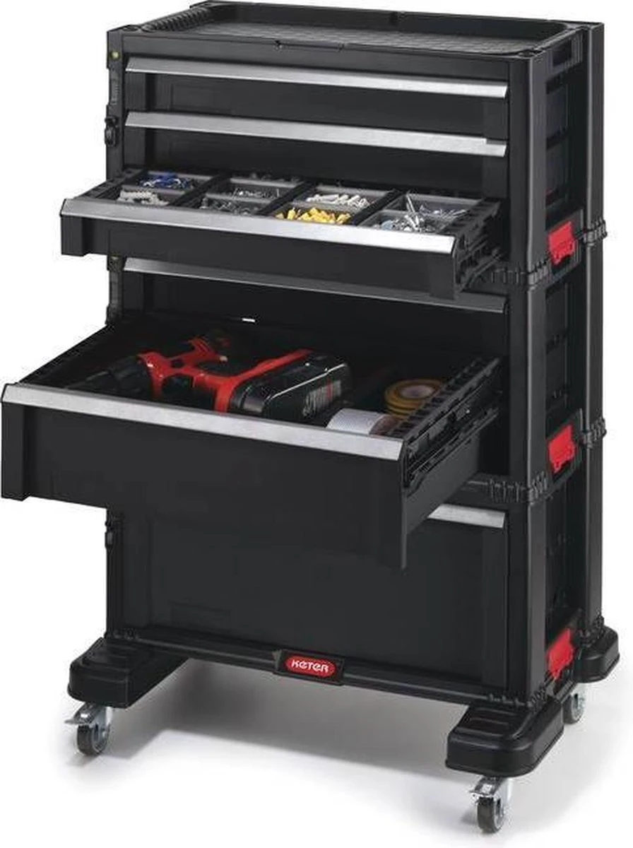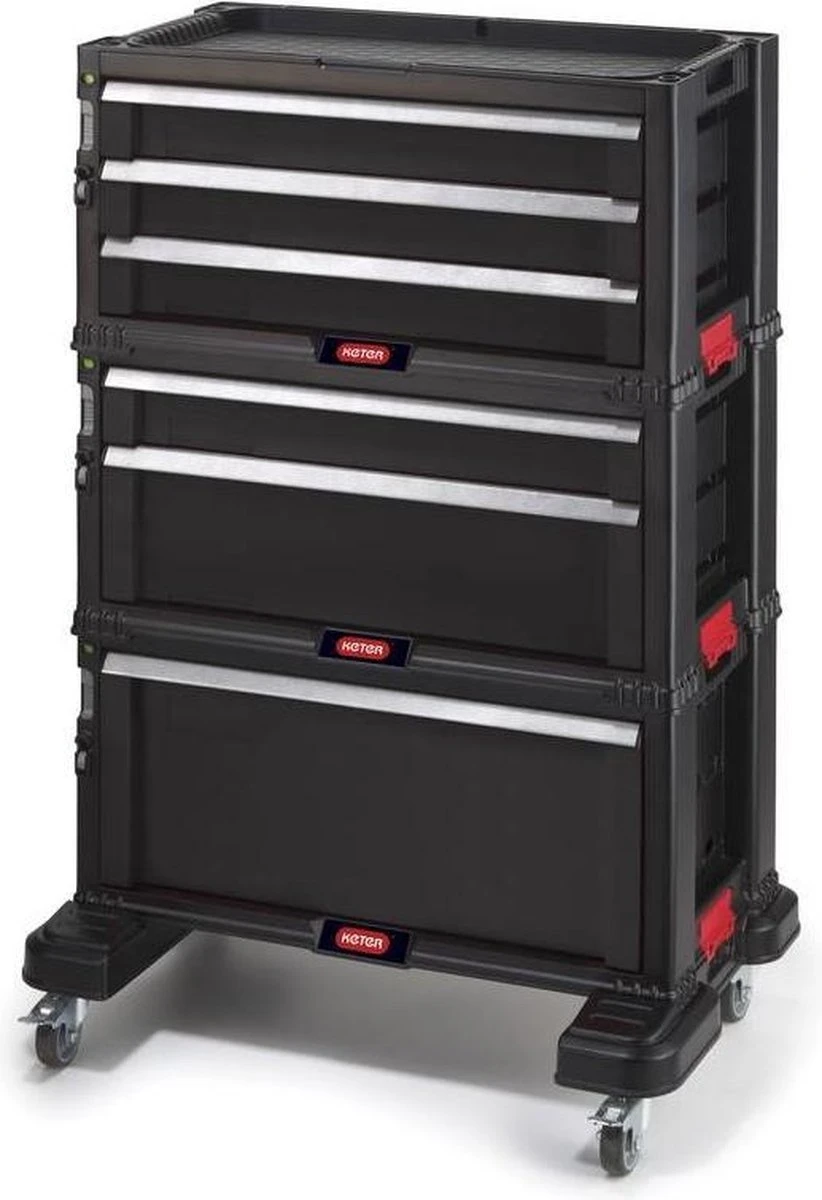 De 3 modules zijn ook afzonderlijk van elkaar mee te nemen; handig wanneer je een klus buiten de deur of op een andere locatie hebt en niet al je gereedschap mee wilt nemen. Mocht je toch de complete kast willen verplaatsen is dat geen probleem dankzij de zwenkwielen.
