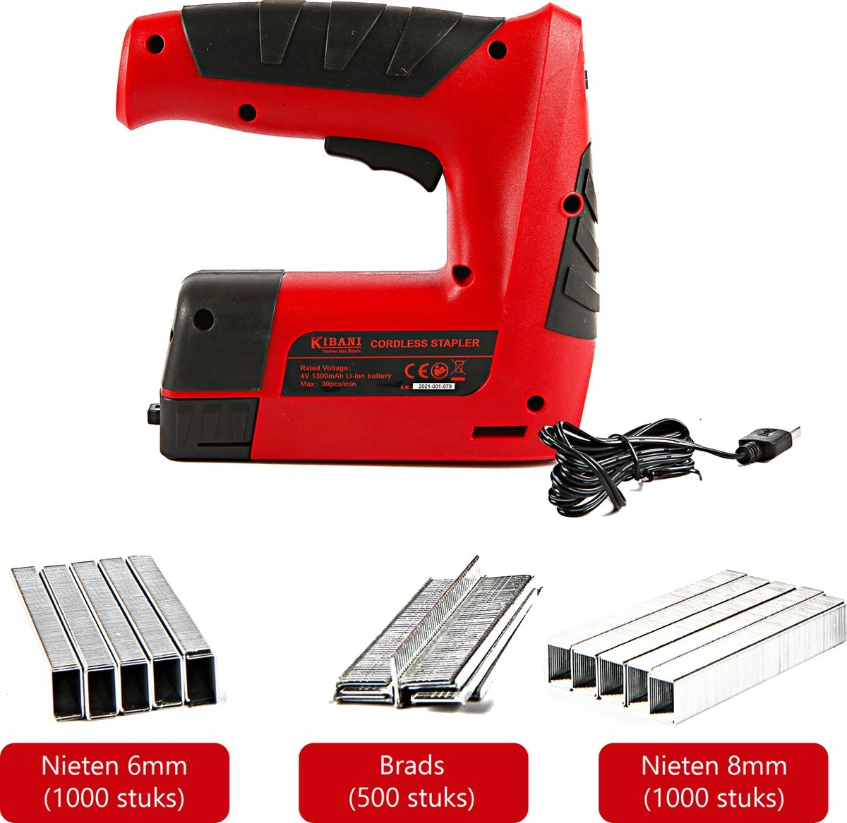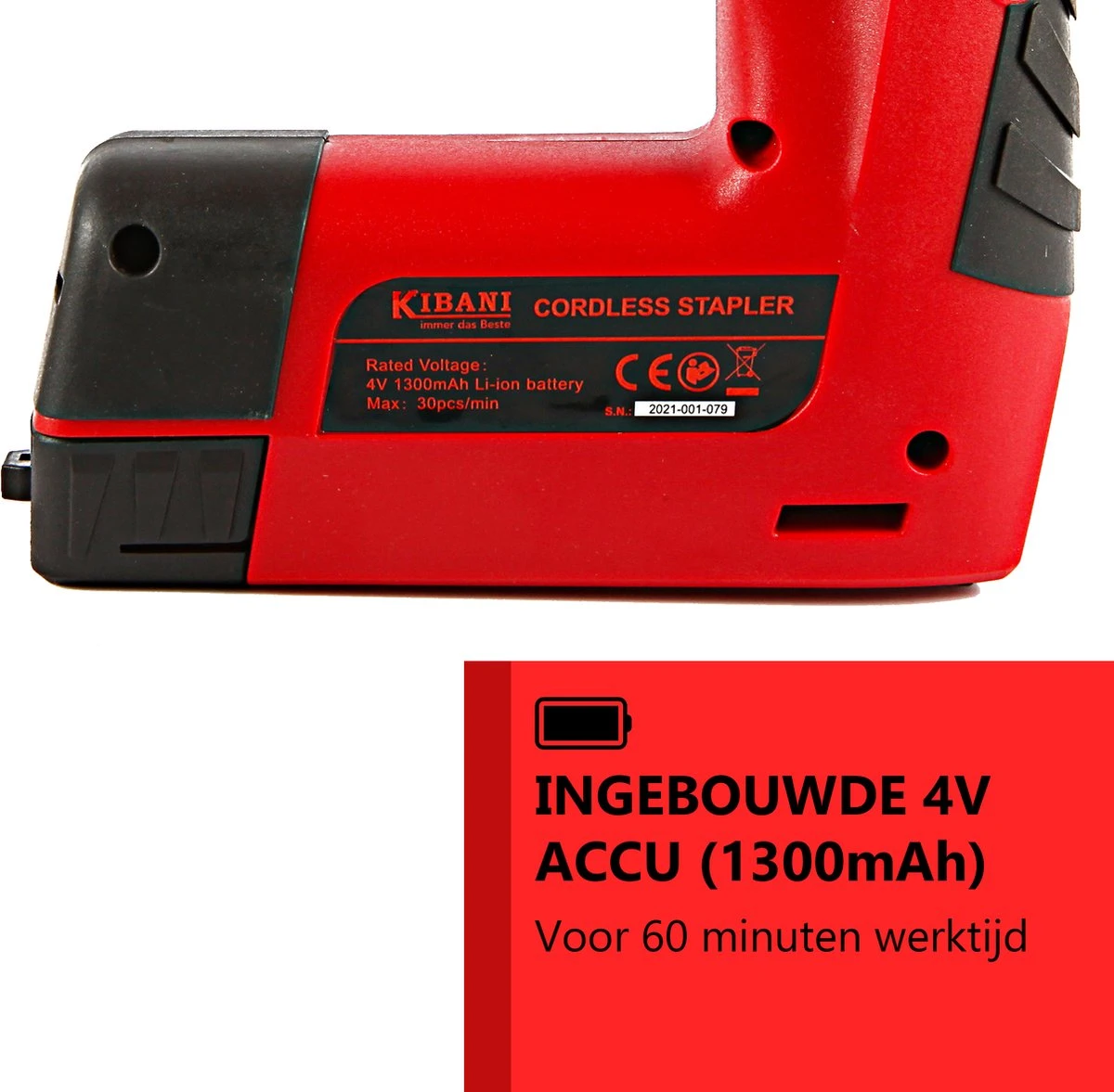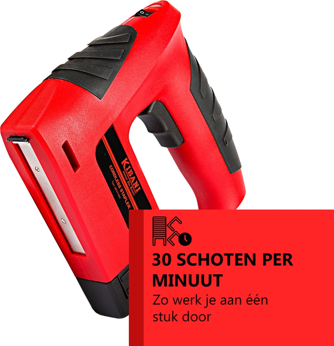De Kibani accu tacker schiet met een hoge schietsnelheid tot 30 nieten per minuut. De tacker heeft de mogelijkheid om zowel nietjes als nagels te gebruiken. Het apparaat geeft aan wanneer het magazijn moet worden bijgevuld door middel van een rood of groen lampje.