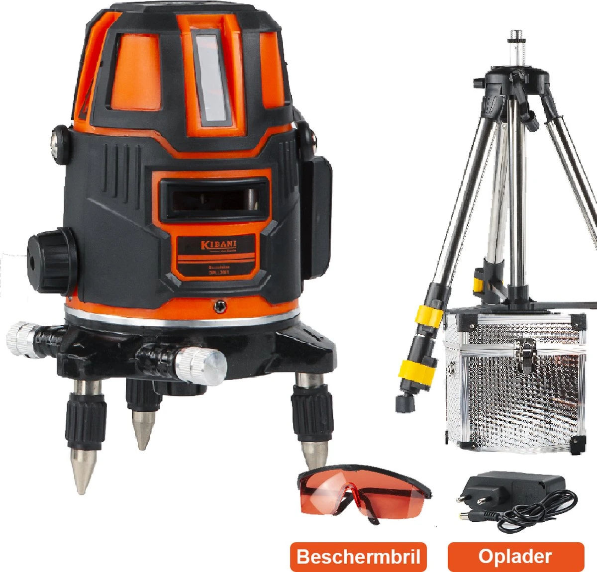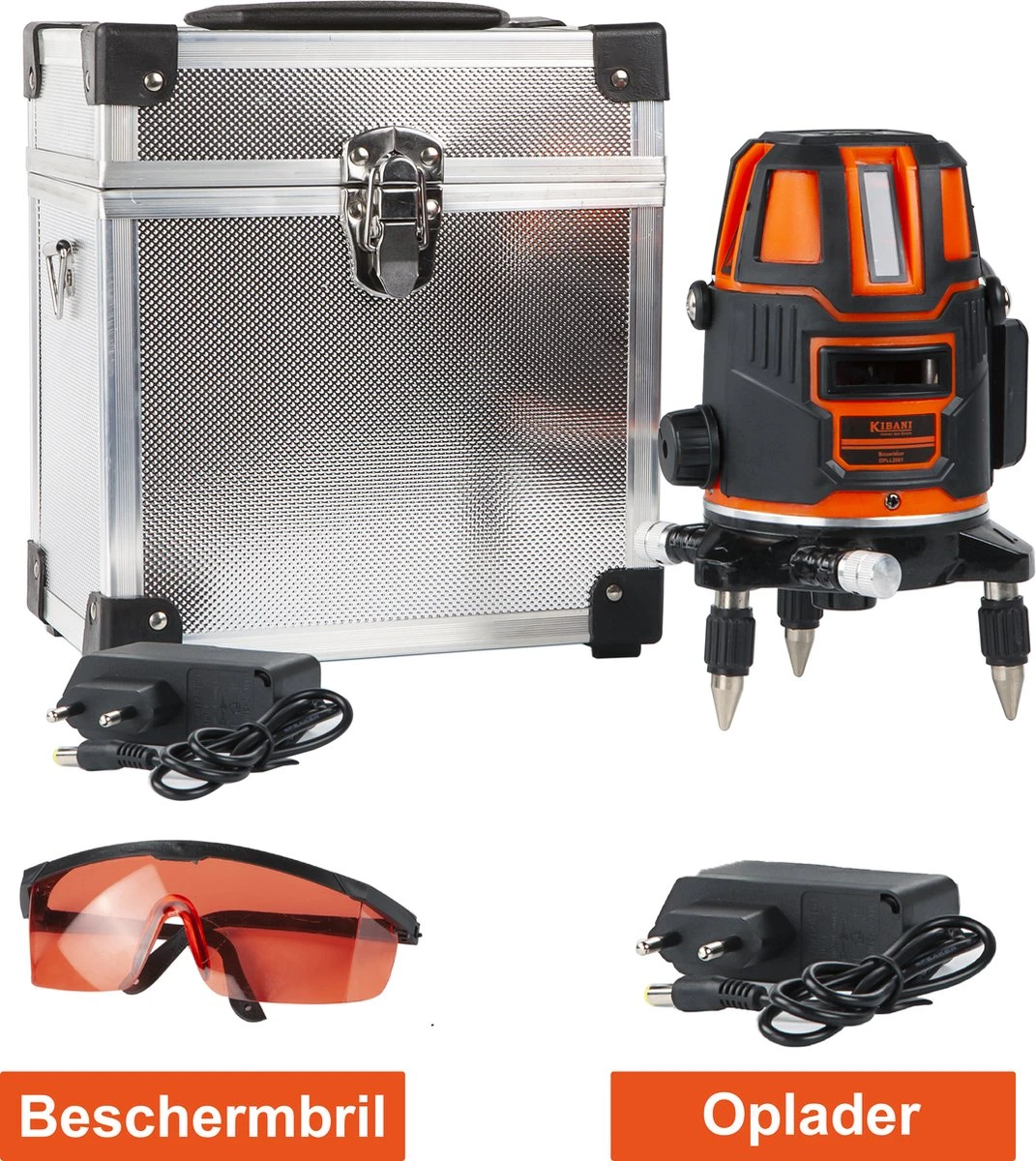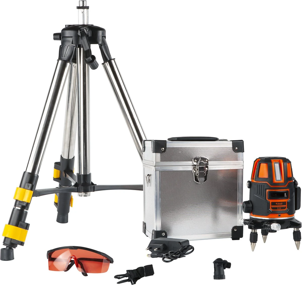 Bij de Kibani bouwlaser worden een paar accessoires meegeleverd. De bouwlaser is verpakt in een zilveren opberg box wat er voor zorgt dat je deze overal mee naar toe kan nemen. Ook bevat de bouwlaser een sterke beschermbril. Deze beschermbril houdt laserstralen tegen zodat je geen oogbeschadigingen op kan lopen. De bouwlaser bevat ook een opzetstuk voor het statief, dit geeft de mogelijkheid om de bouwlaser te kantelen.