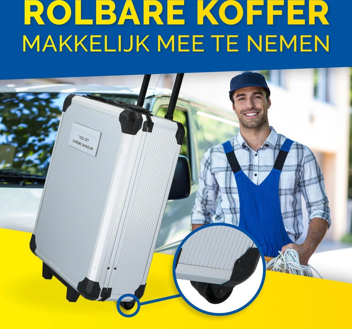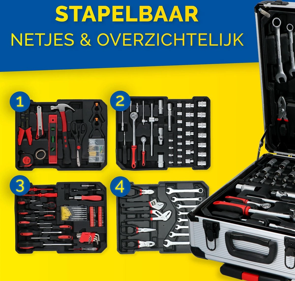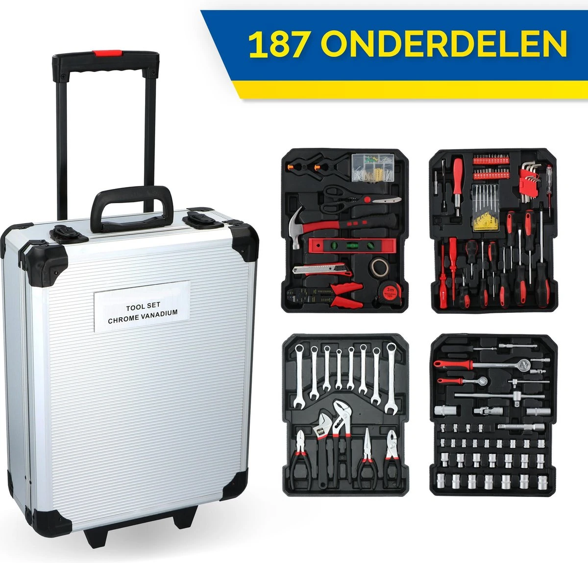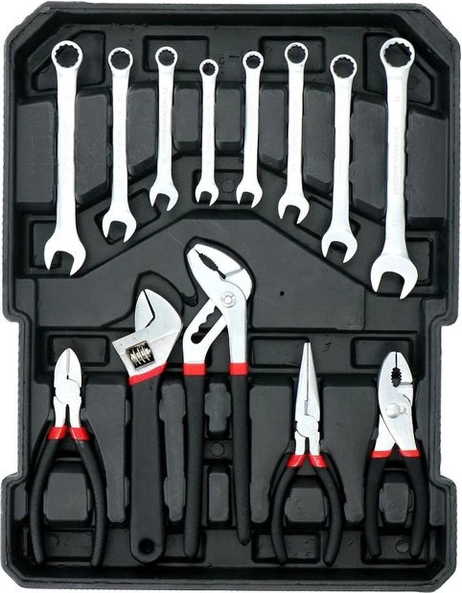 De set is zeer uitgebreid met onder meer vele soorten en maten tangen, schroevendraaiers, sleutels en bits. Het gereedschap zelf is gemaakt van chroom vanadium staal (CRV). Dit materiaal is een legering van staal die naast het gebruikelijke koolstof ook chroom en vanadium bevat. Dit maakt het handgereedschap extra hard en daarmee kwalitatief beter. De toevoeging van chroom beschermt het gereedschap bovendien beter tegen corrosie en oxidatie.