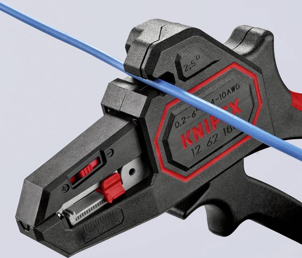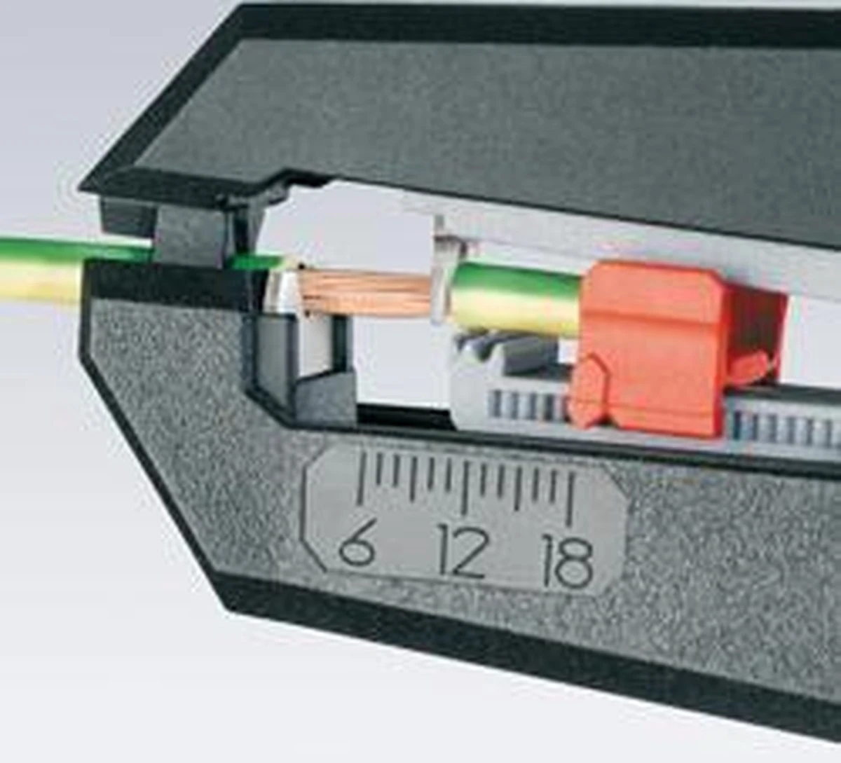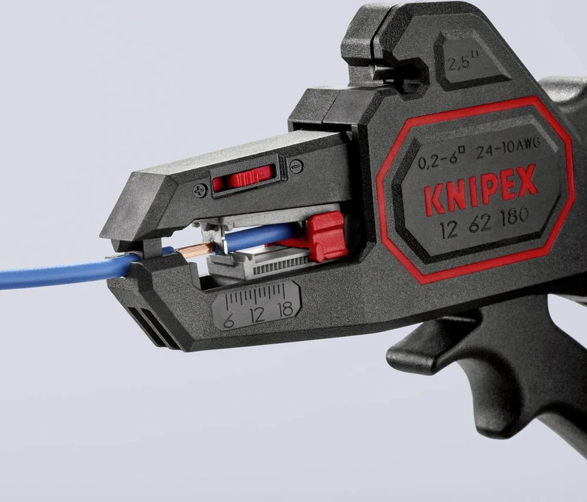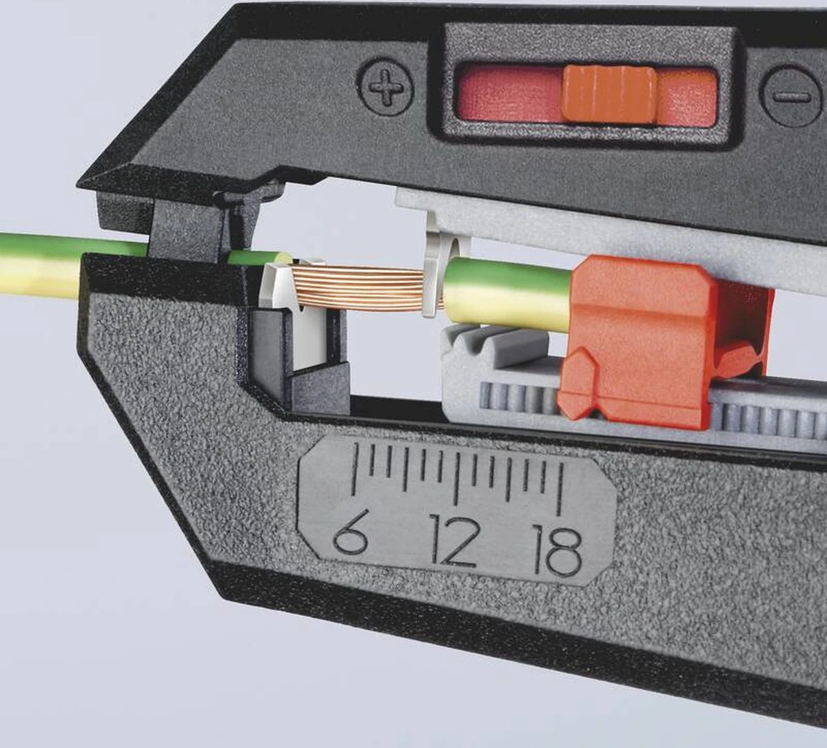 - Met instelbare lengteaanslag van 6,0 – 18,0 mm voor gelijke afstriplengtes.