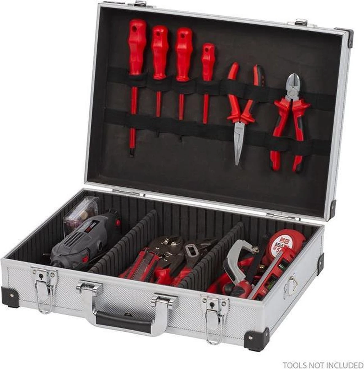 In deze opbergkoffer met aluminium frame van Kreator kan je je gereedschap in drie opbergvakken van elkaar scheiden. De vakken kan je naar wens verplaatsen en bovenaan berg je je accessoires keurig op achter de elastische bandjes. De stevige, maar tegelijk lichte koffer met binnenbekleding meet 420 x 300 x 125mm.