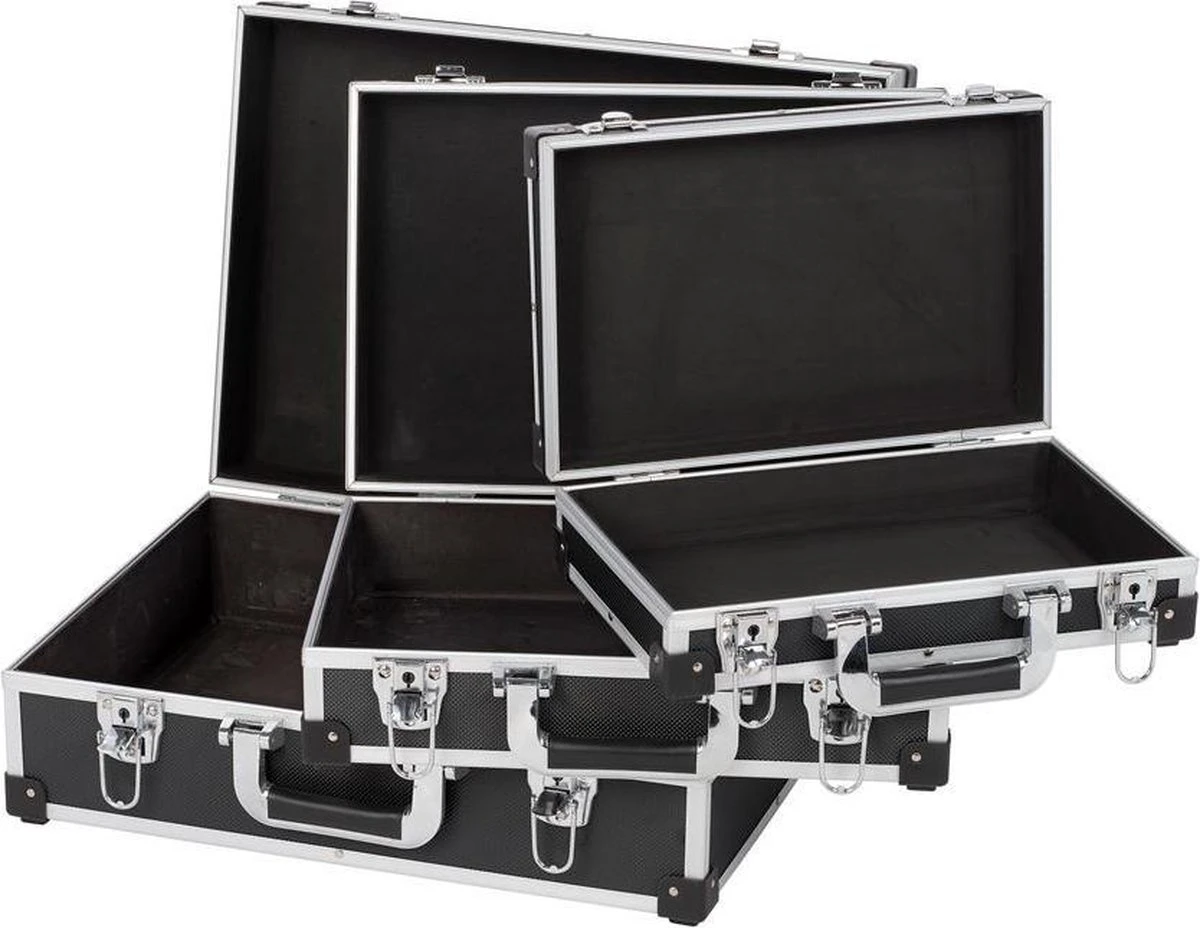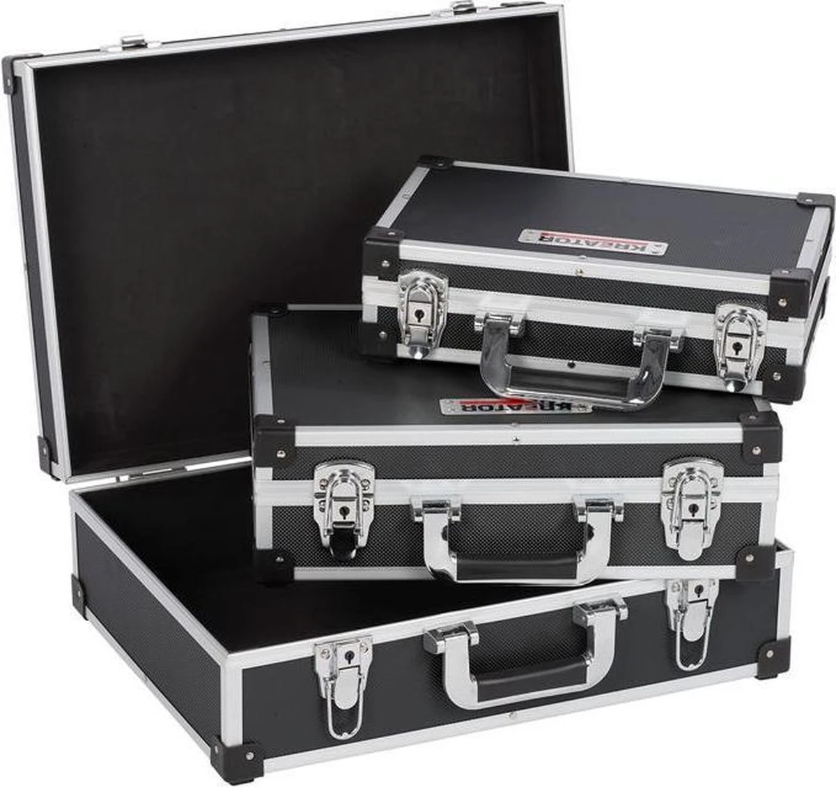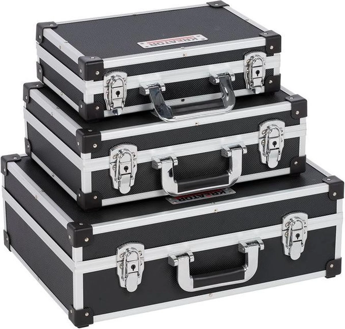 Berg al je kleine en grotere gereedschappen, fotoapparatuur, meetinstrumenten, dvd’s, enz. netjes op in deze 3-in-1 opbergkoffers met aluminium frame van Kreator. De stevige, maar tegelijk lichte koffers met binnenbekleding meten 330 x 210 x 90 mm (kleinste), 380 x 260 x 120 mm (middelste) en 460 x 330 x 160 mm (grootste).