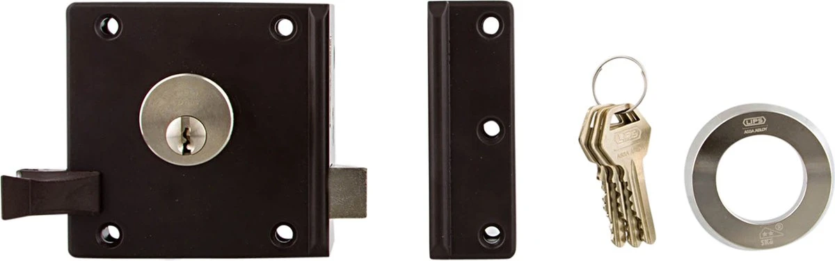 | Verpakkingsinhoud | Lips oplegslot Sluitkom Veiligheidsrozet SKG2 Montageplaat tbv de rozet Schroeven tbv montage rozet Schroeven tbv montage oplegslot Schroeven tbv montage sluitkom Bruine dopjes om de schroeven af te dekken 3 sleutels |