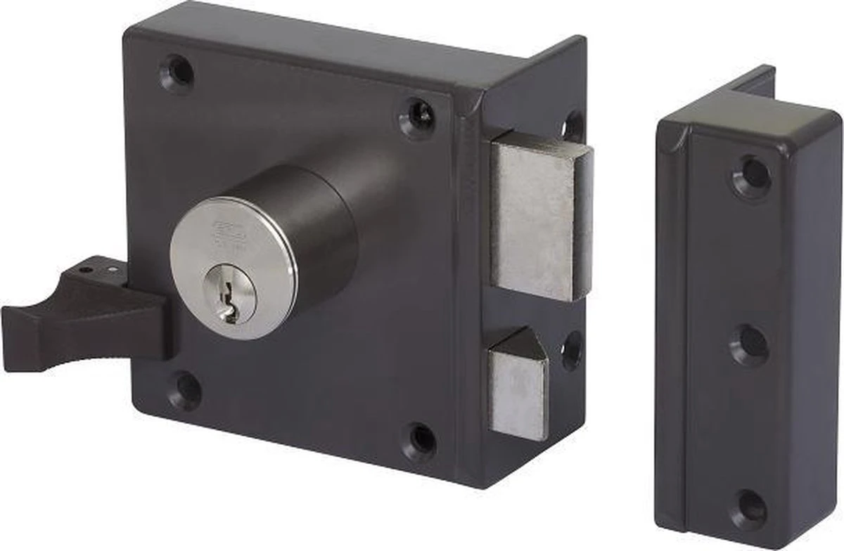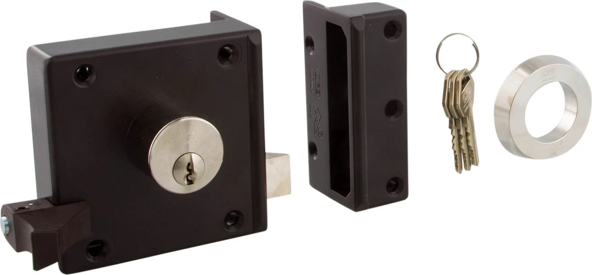 Dag en nacht opleg cilinder slot Lips, 50 mm, vaste cilinder 1753, draairichting 1 binnendraaiend. Veiligheidsslot klasse Zwaar. Kast afmeting 99 x 98 x 18 mm. Met sluitkast 51,5 x 98 mm. Het slot is leverbaar in bruin gelakte uitvoering en heeft een trekknop voor dagschootbediening aan de binnenzijde. De vaste cilinders zijn vernikkeld. Inclusief veiligheidsrozet en 3 sleutels. Dagschoot vast te zetten in ingetrokken toestand.