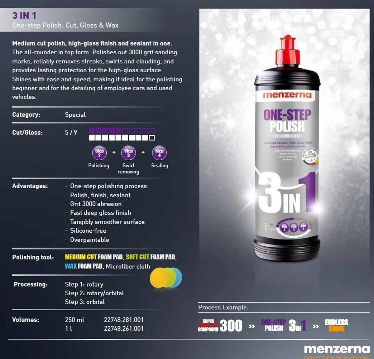Deze veelzijdige medium polish corrigeert, finisht en beschermt in één gemakkelijk stap. One-Step Polish 3in1 verwijdert swirls, oxidatie en andere lichte lakdefecten en laat een fraaie glans achter. Geschikt voor zowel roterende als excentrische polijstmachines.Gemakkelijk in gebruik, siliconenvrij en geeft een duurzame bescherming.Ook verkrijgbaar in 1000ml verpakking.