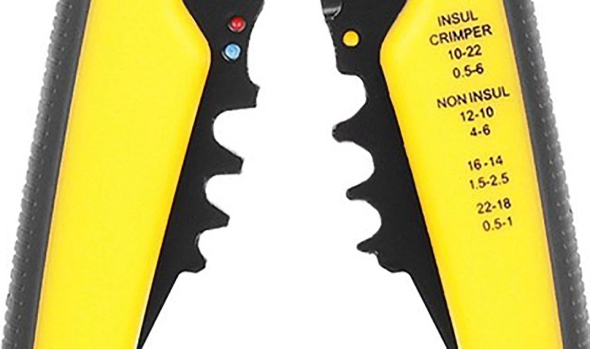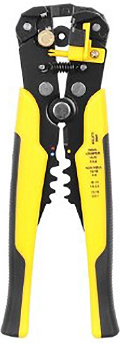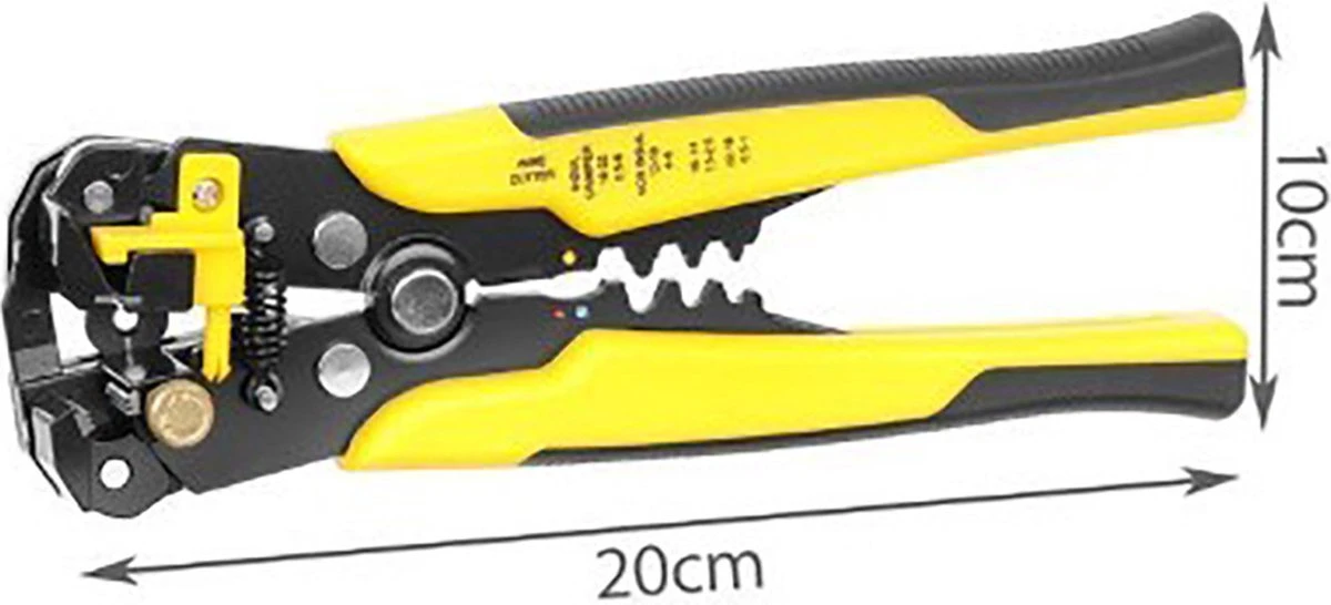 SPECIFICATIE – kleur: geel-zwart; materiaal: chroom vanadium staal / PP / TPR; antislip pad: JA; uurwerk: voorzijde, automaat; strippen van isolatie van kabels met een diameter van 0,2 – 6 mm2 (10 – 24 AWG); krimpen van geïsoleerde connectorklemmen: 0,5 – 6 mm2 (22-10 AWG) en niet-geïsoleerd: 4 – 6 mm2 (12-10 AWG), 1,5 – 2,5 mm2 (16-14 AWG), 05 – 1 mm2 (22-18AWG )); afmetingen (lengte / breedte / hoogte): 20/10/3 cm; gewicht: 0,35 kg; gewicht in de verpakking: 0,4 kg.