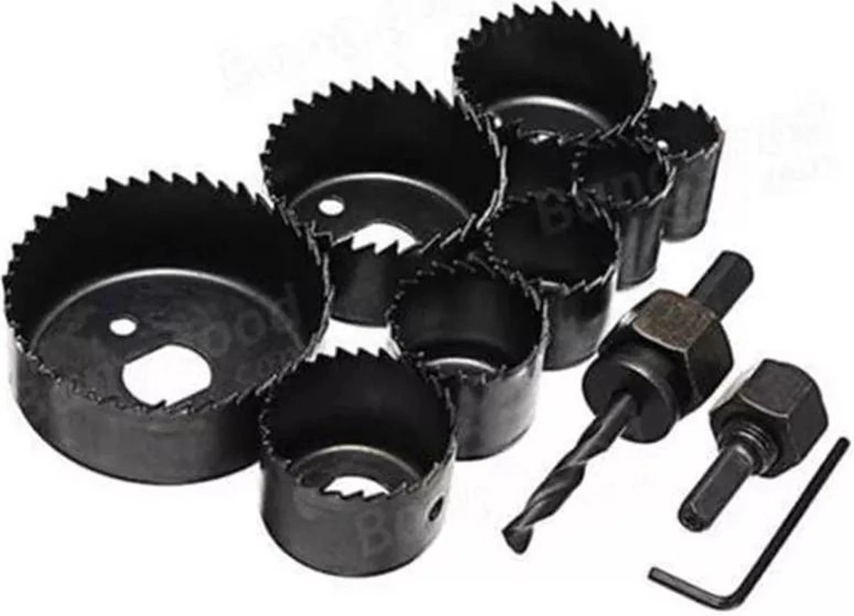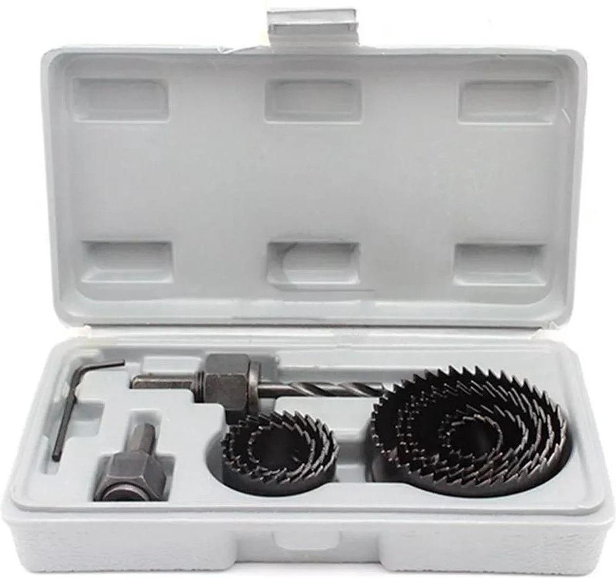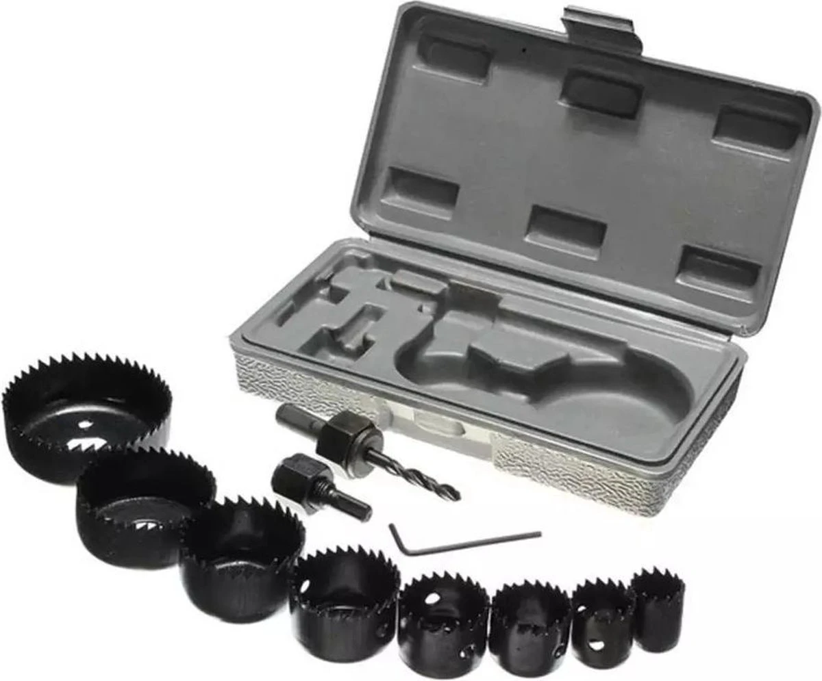 De serie wordt geleverd in een kunststof kist en omvat de volgende diameters: 19mm, 22mm, 28mm, 32mm, 38mm, 44mm, 51mm en 64 mm met een snedediepte van 28 mm.