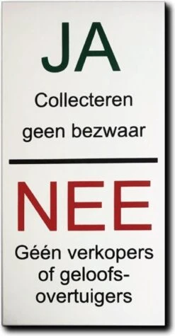 Nee ja bordje bordje gezeefdrukt op Aluminium. Een duidelijke NEE Geen Colportage bordje. Wilt u geen verkopers en geloofovertuigers ontvangen maar wel Collectes? Gebruik dan dit aluminium bordje met plakstrip. Materiaal: aluminium met plakstrip Formaat: 100 mm x 50 mm x 1 mm. Aluminium Geen verkopers Bordje wel collectes. Geen colportage.