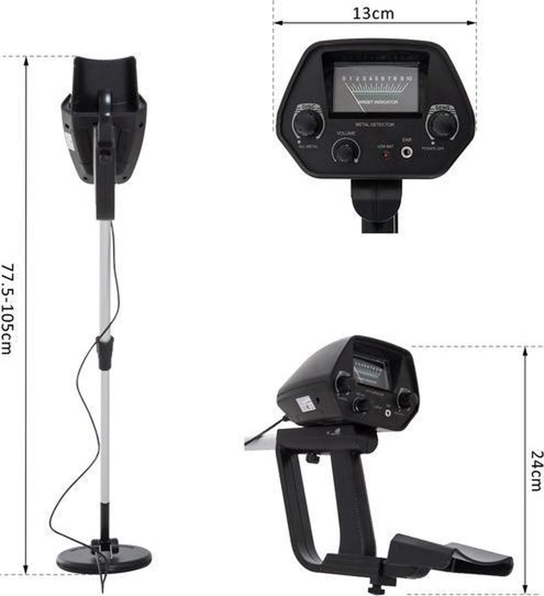 Gloednieuwe, hoogwaardige metaaldetector met waarmee u kunt zoeken naar munten, relikwieën, juwelen, goud en zilver en andere metalen. het aangenaam lichte apparaat weegt slechts 900 gram. De metaaldetector is uigerust 2 modi en detecteert alle soorten metaal of negeert ijzer in discriminatiemodus. U kunt de telescopische stang flexibel instellen tussen 77,5-105 cm lang. Het volume van de signaaltoon kan ook worden aangepast. Een 3,5 mm-aansluiting voor een hoofdtelefoon is natuurlijk geïntegreerd. De zoekspoel is waterbestendig, zodat u gemakkelijk kunt zoeken, zelfs als het regent of in de ochtenddauw. Eenvoudige functies, ongecompliceerde bediening en geweldige prijs. De speurtocht kan beginnen met de metaaldetector!
