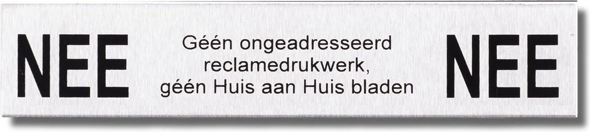 NEE NEE brievenbus sticker RVS. Zeer mooie zeefdruk bedrukking van de variant “NEE NEE brievenbus sticker” op RVS. Dit RVS bordje heeft een luxe uitstraling op uw brievenbus. Nee nee Bordje. Wilt u geen reclame en folders meer ontvangen in uw brievenbus, dan kunt u een NEE-NEE-sticker of een NEE-JA brievenbus sticker bordje op uw brievenbus plakken. Materiaal: RVS met plakstrip Formaat: 125x25x0,5 mm Tekst: nee geen ongeadresseerd reclamedrukwerk nee geen huis aan huis bladen