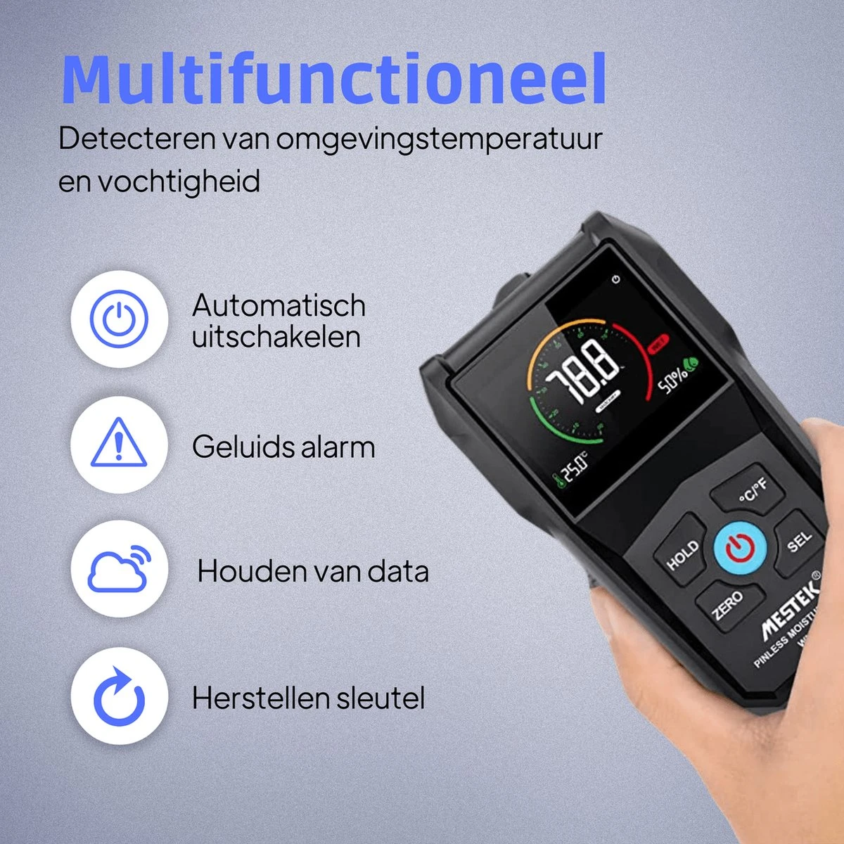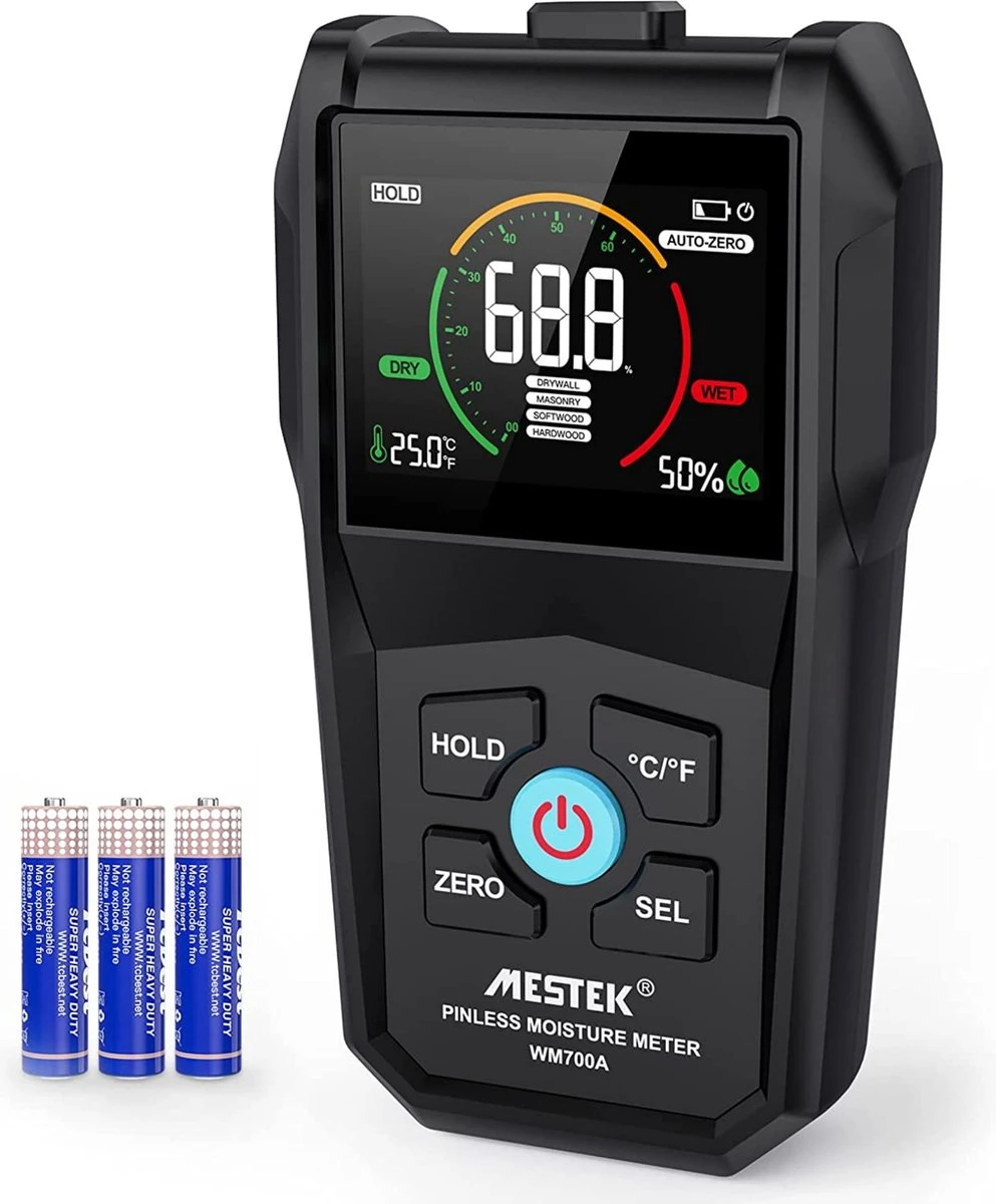 Nauwkeurig het vochtgehalte van jouw muren, hout of vloeren meten? Met de Mestek vochtmeter doe jij dit eenvoudig zelf. Selecteer één van de vier modi en lees de resultaten af via het gebruiksvriendelijke LCD scherm. De hygrometer is volledig pinless en extra nauwkeurig door de geïmporteerde sensoren.