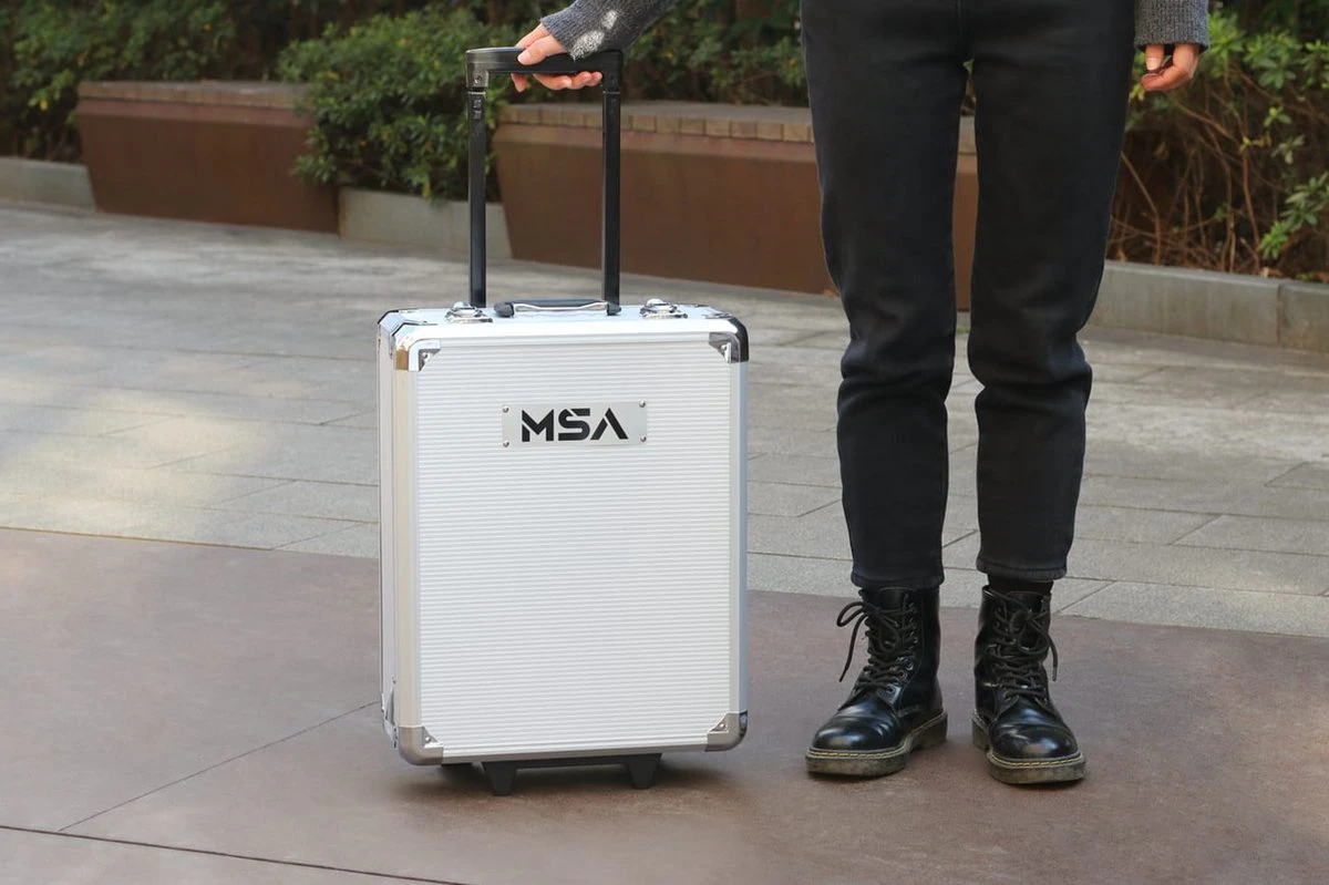 - De afsluitbare koffer is voorzien van wieltjes en uitschuifbaar handvat