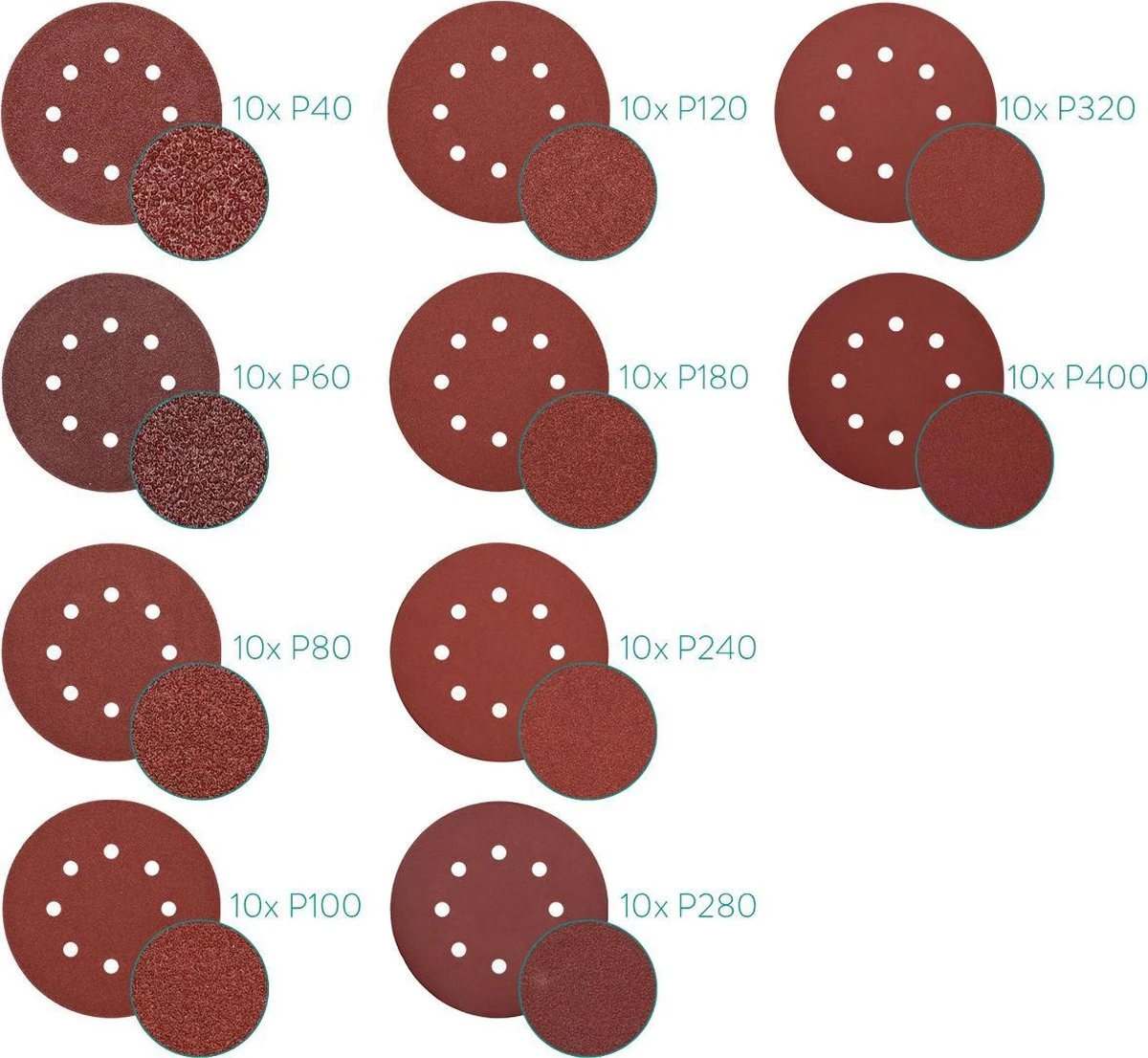 - De verschillende korrels van P40 tot en met 400 maken verschillende slijpresultaten mogelijk. De ronde vellen zijn geschikt voor het gladmaken van kleine oneffenheden tot meer intensieve schuurprojecten