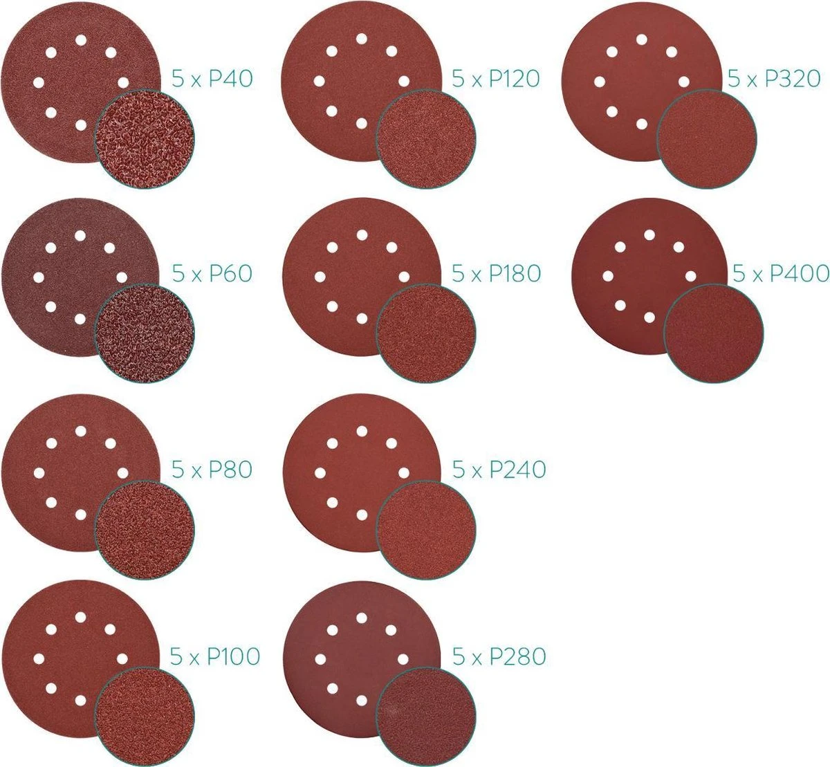 - DETAILS: Je ontvangt 50 vellen schuurpapier met verschillende korrelgroottes van grof tot fijn: P40, P60, P80, P100, P120, P180, P240, P280, P320 en P400. De set bevat vijf stuks van elke soort.