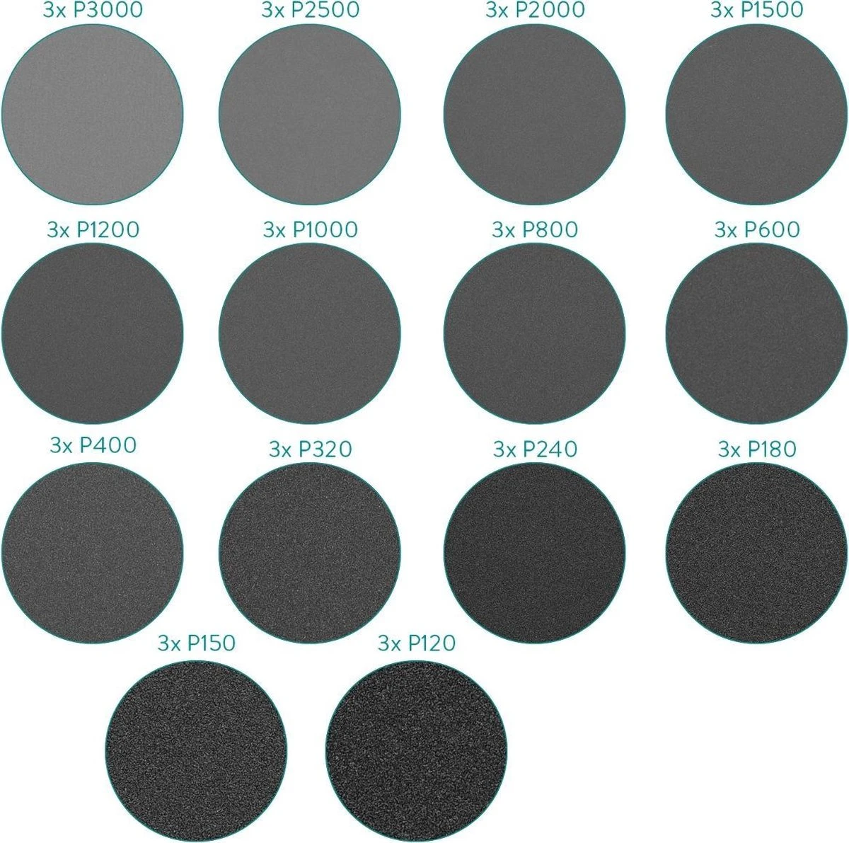 - De verschillende korrels van P120 tot P3000 maken verschillende slijpresultaten mogelijk. Hoe hoger de korrel, hoe fijner het resultaat.