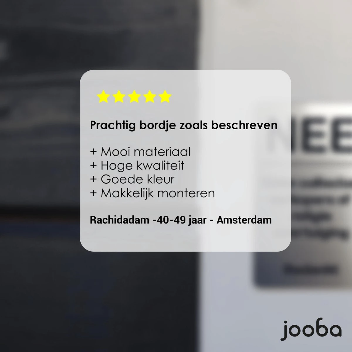 Vaak hebben dit soort bordjes een onvriendelijke uitstraling die de boodschap niet altijd ten goede komen. Door middel van de vorm en lettertype wordt met dit deurbordje op een nette en vriendelijke wijze duidelijk gemaakt dat ongewenst bezoek aan de deur niet gewenst is.
