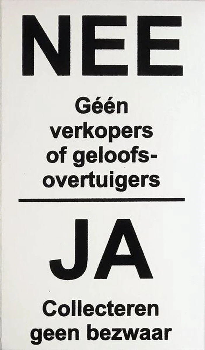 Geen colportage of verkopers? Gebruik dan onze bordjes. Ook hebben wij de bekende JA NEE en NEE NEE stickers tegen ongewenste reclame in ons Bol assortiment, maar dan van aluminium. Kleurecht en krasvast. NEE Géén collectes, verkopers of geloofsovertuigers, JA wel collectanten