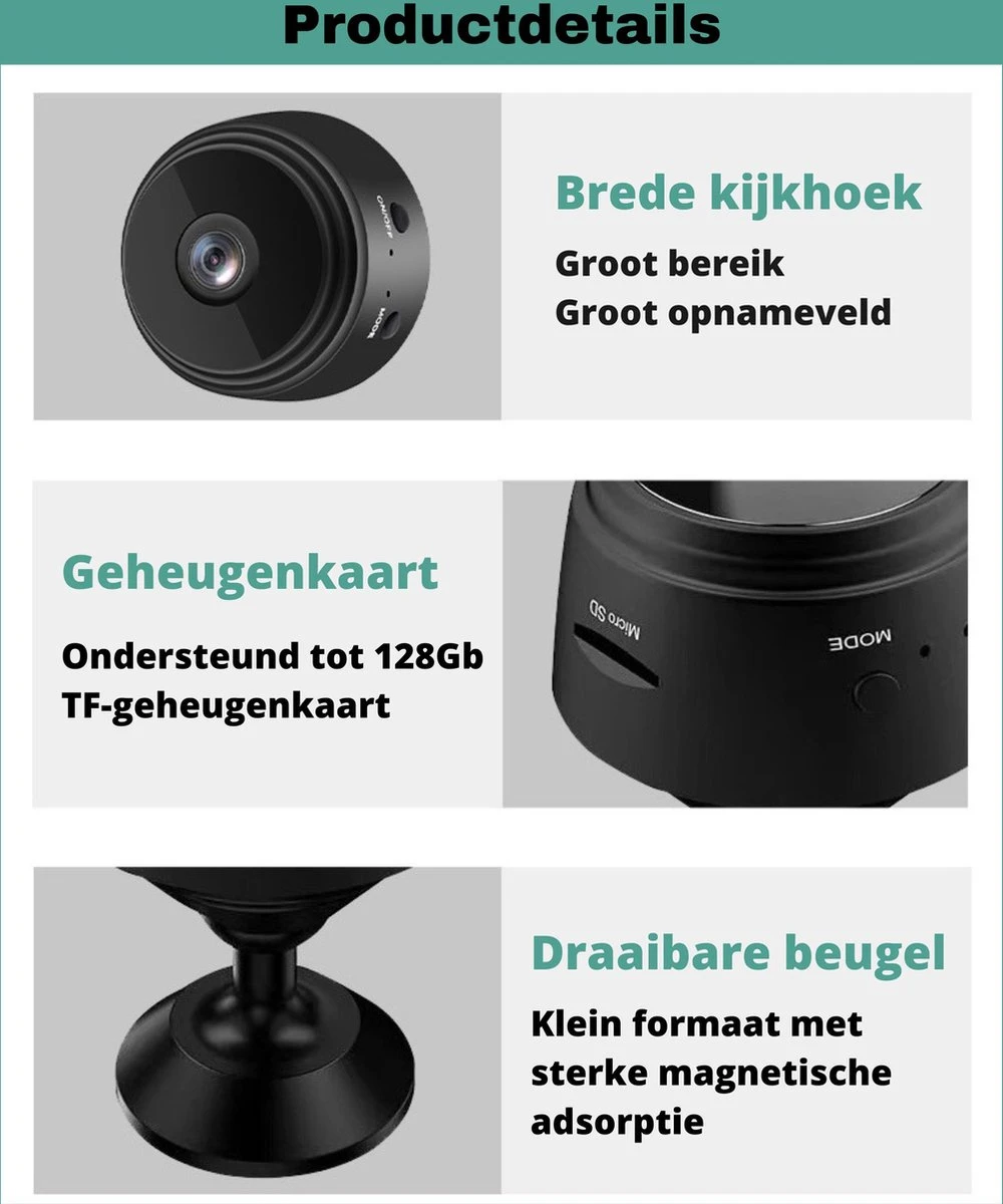 ✓ Opslag opnames: Micro SD-kaart tot 128GB (niet inbegrepen)