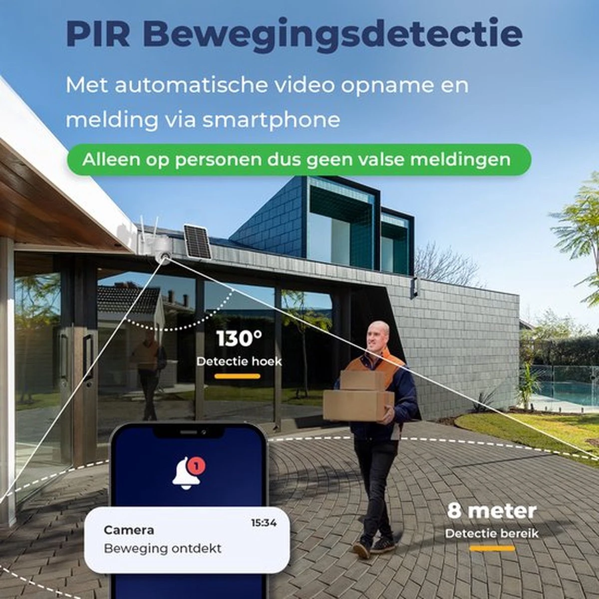 Beweegt er iets terwijl dat niet zou moeten? Dan slaat de Solar Powered Smart Alarm PTZ Security Camera alarm en wordt er automatisch beeld opgenomen. De camera reageert alleen bij menselijke bewegingen (lichaamswarmte) en niet bij wind or schaduw.