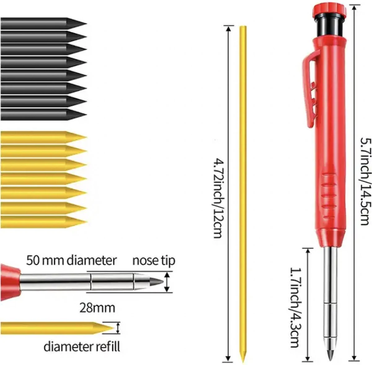 Het markeerpotlood heeft een handige clip waarmee je het potlood aan je gereedschapsriem kunt bevestigen, zodat je het altijd bij de hand hebt tijdens je werkzaamheden. Het heeft ook een ergonomisch ontwerp, waardoor het comfortabel in de hand ligt en gemakkelijk te hanteren is.