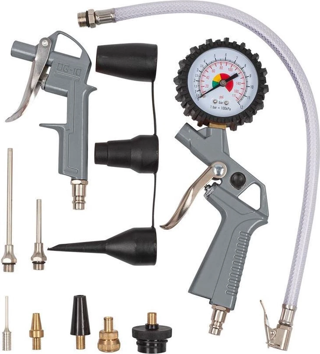 In deze set vind je niet één maar zelfs twee pistolen om op je compressor aan te sluiten. Met het blaaspistool en de bijhorende opzetstukken kan je gemakkelijk vuil en stof wegblazen. Zelfs dat hoopje stof dat al jaren in dat onbereikbare hoekje van je auto vast zit, vormt geen probleem.