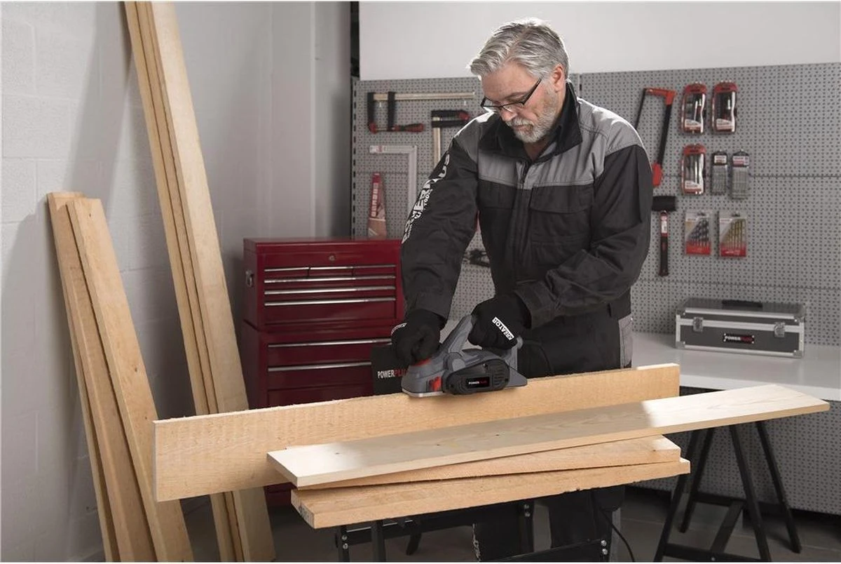 Houten oppervlakken gladschaven, hoeken afschuinen of sponningen maken, het gaat allemaal met deze schaafmachine van 900 W. Je schaaft met een breedte van 82 mm, waardoor het werk goed vooruitgaat. Je bepaalt ook zelf hoeveel hout je wegneemt. De schaafdiepte stel je namelijk heel precies in tussen 0 en 3 mm.