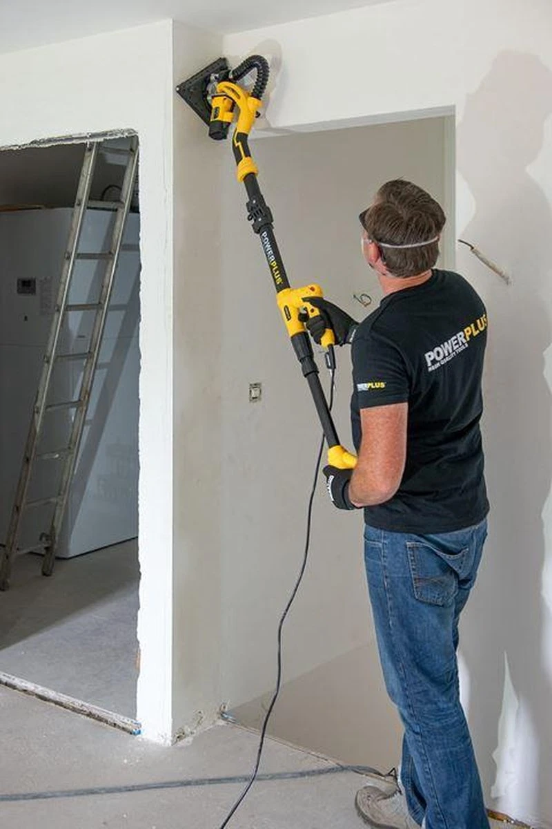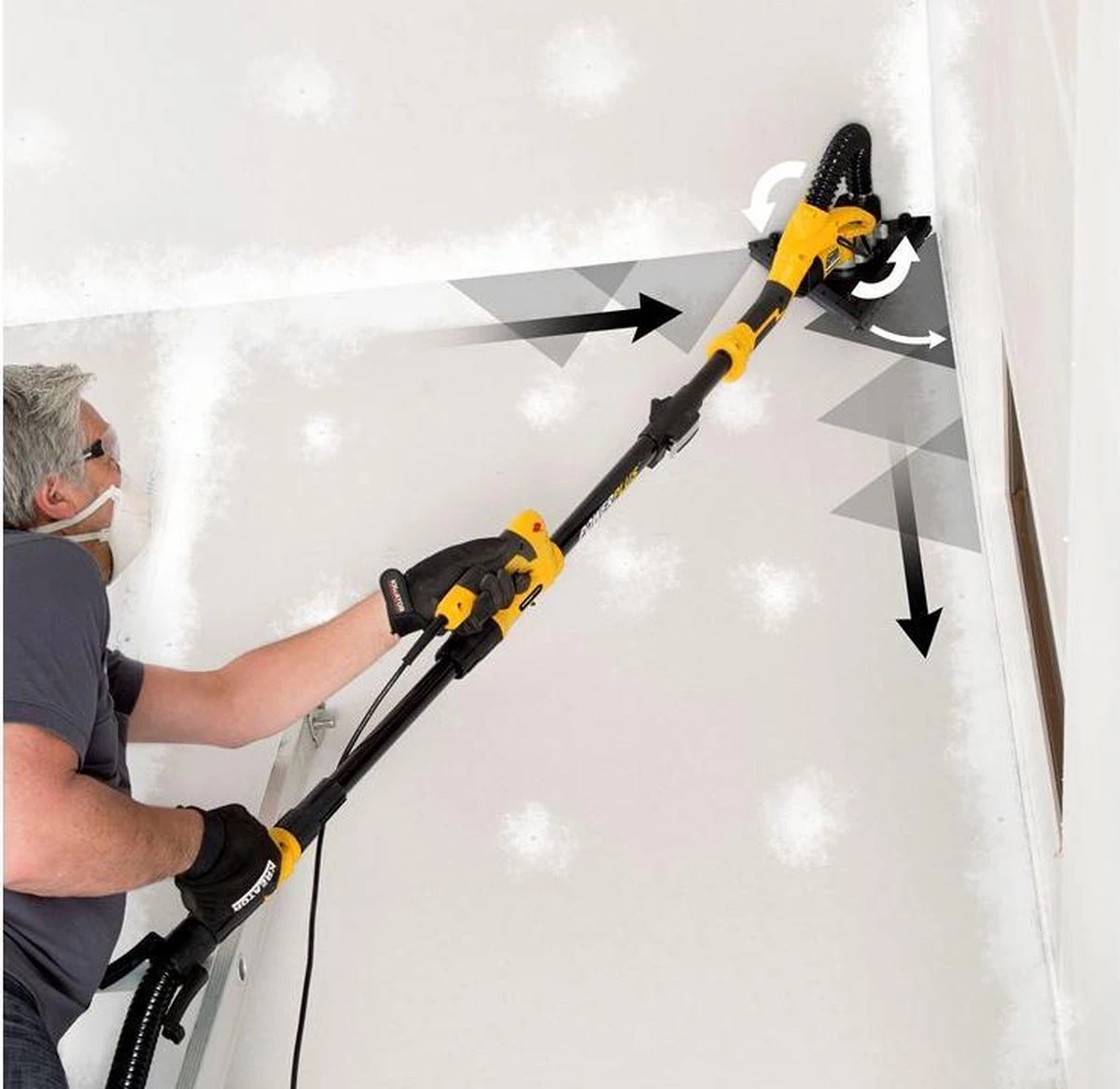 Deze langnekschuurmachine is de perfecte hulp bij het schuren van plafonds en hoge muren. Het hoge bereik van dit lichtgewicht laat je toe om veilig en stabiel vanaf de grond te schuren en niet balancerend vanop een ladder.