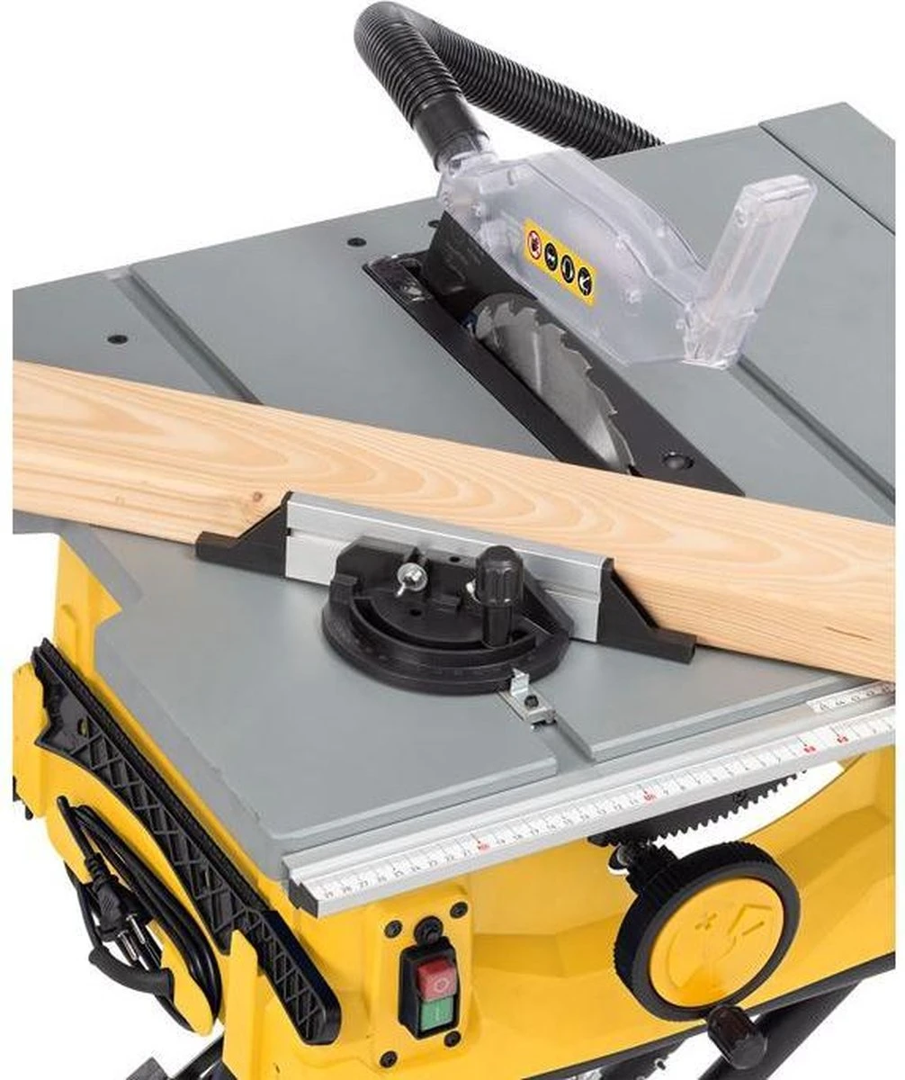 Deze 2000W tafelzaag heeft een werkblad van 576 x 650mm. Laat je houten platen comfortabel rusten op het grote tafelblad van deze Powerplus-tafelzaag en werk op een ergonomische werkhoogte van 917mm. Je stelt eenvoudig de hoek en hoogte in van het Ø250mm zaagblad. Met de hulp van de verstekgeleider en zijgeleider werk je zeer precies en zaag je tot 85 mm diep bij een overlangse of dwarse zaagsnede of tot 60 mm onder een schuine hoek van 45 graden.