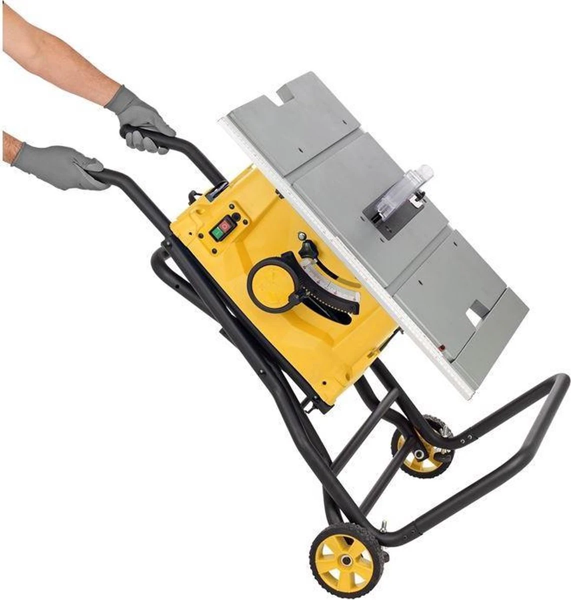 + Met de wieltjes rij je de tafelzaag naar de gewenste plaats.