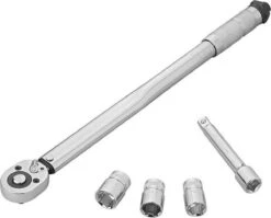 Draaimomentsleutel in koffer met 3 doppen. Een chroom vanadium stalen (draai)momentsleutel in handige bewaarkoffer. Handig voor onderhoud en reparaties aan auto, camper, caravan etc. Inclusief 17mm, 19mm en 21mm doppen en verlengstuk van 10 cm. Lengte sleutel: 46 cm. Draaimomentsleutel/Dynamometrische sleutel.