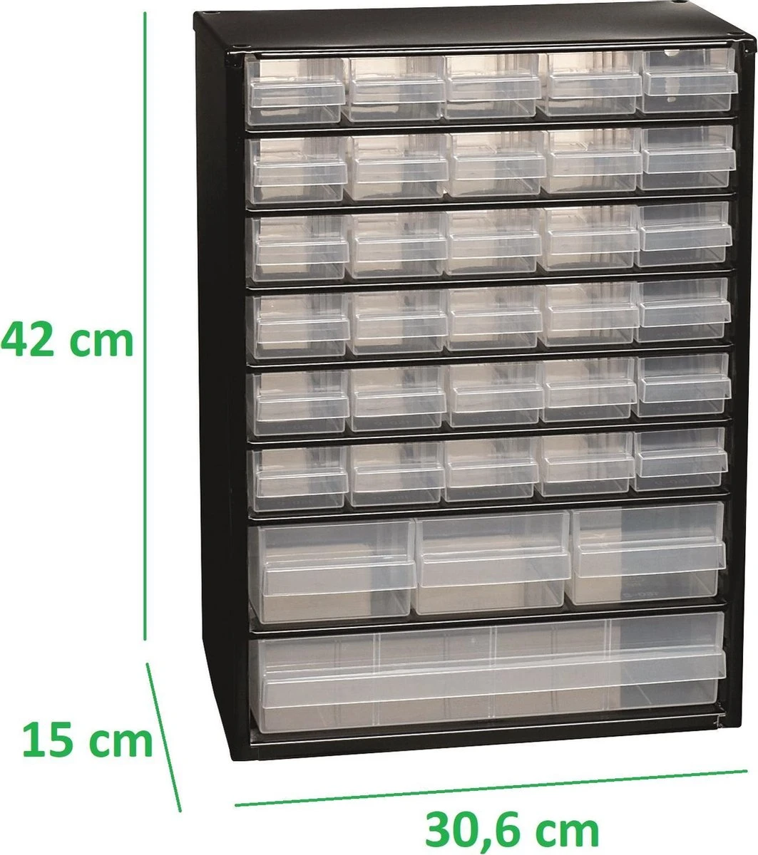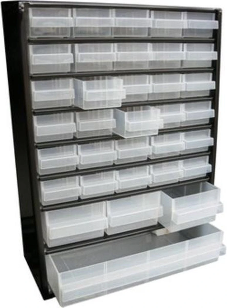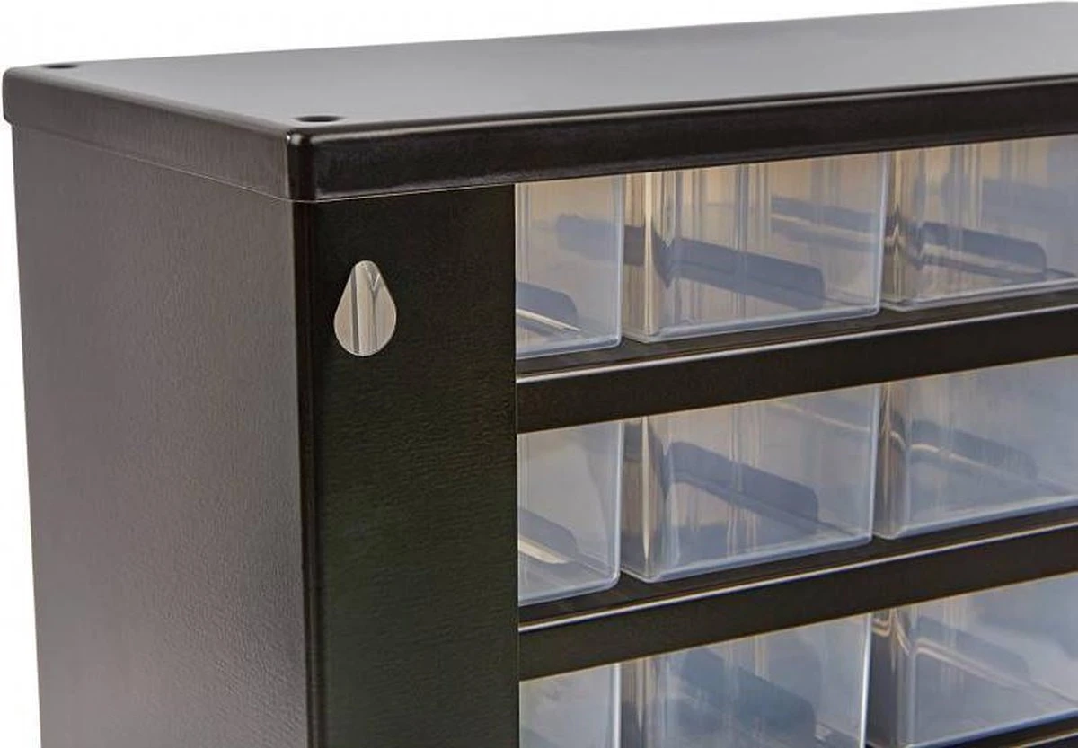 Stevige metalen ladekast van Raaco met 34 polypropyleen laden. Er worden 10 tussenschotten meegeleverd voor de kleine laden zodat je deze naar wens kunt indelen. De ladenbakjes zijn transparant zodat je in een oogopslag ziet wat er in zit. De ladekast is geschikt voor muurbevestiging en is eenvoudig te monteren aan de wand. Ideaal voor in de werkplaats of hobbyruimte voor het opbergen van kleinere materialen zoals schroeven, pluggen en spijkers.