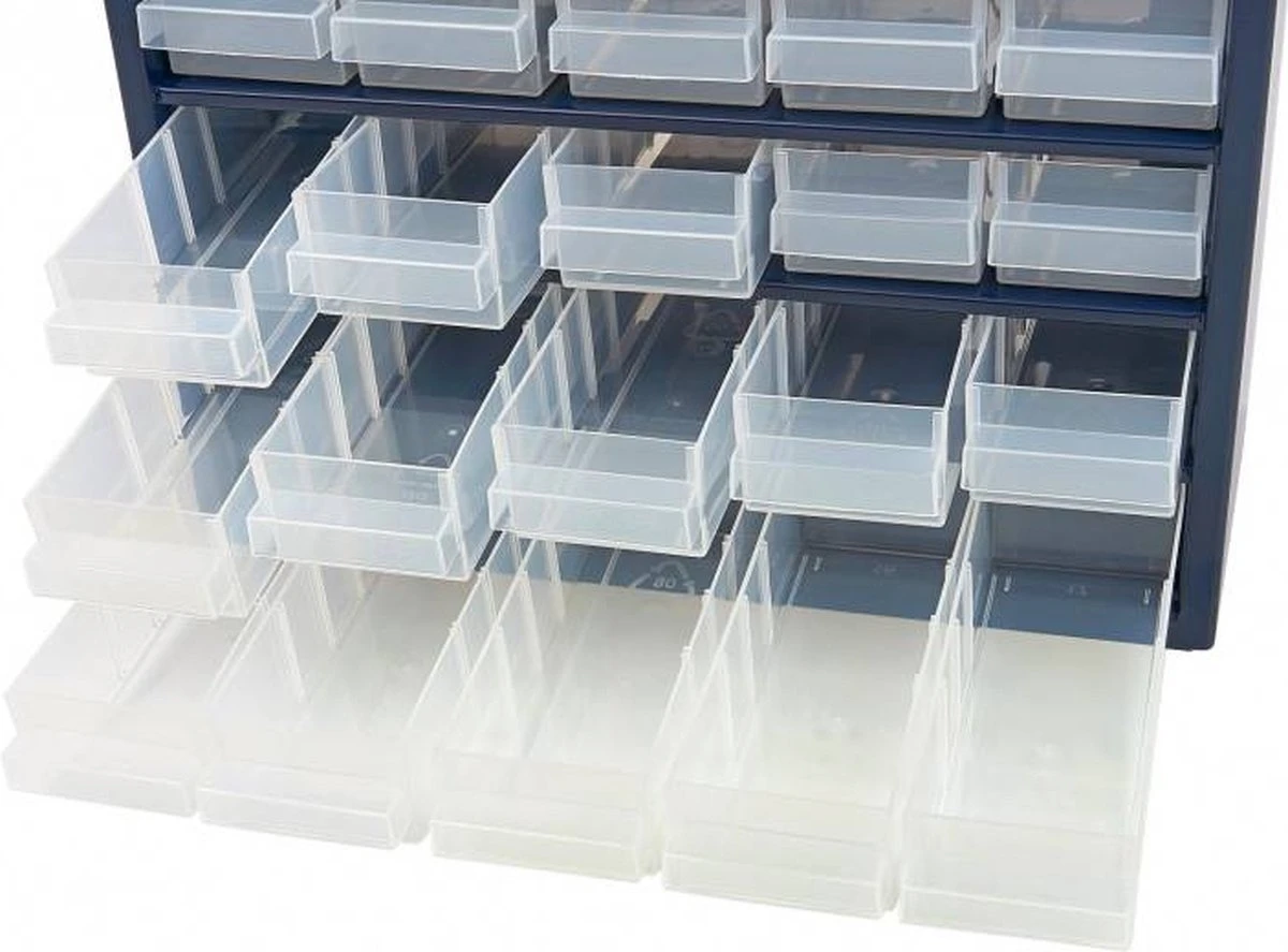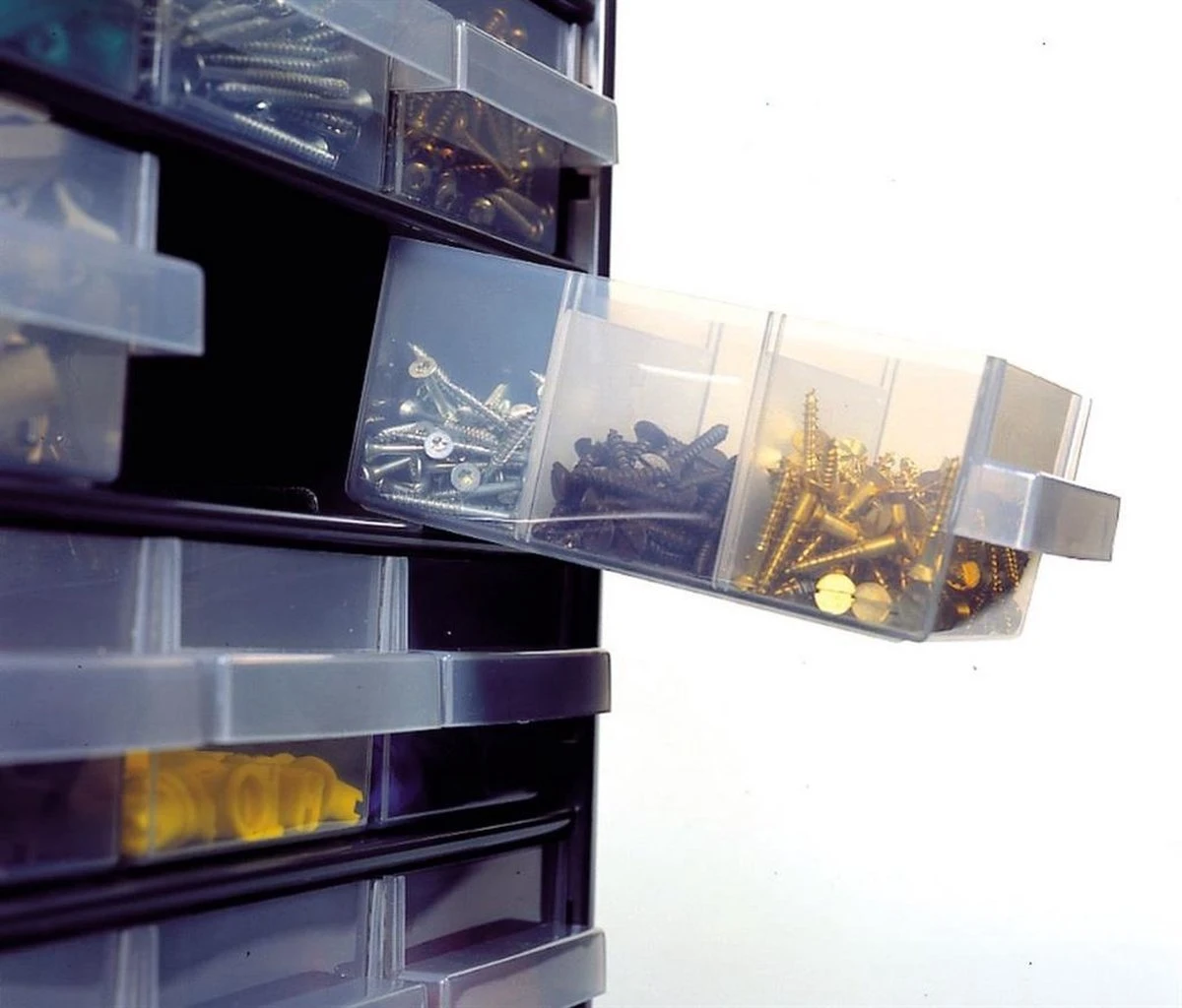Stevige metalen ladekast van Raaco met 60 polypropyleen laden. Er worden 10 tussenschotten meegeleverd zodat je enkele laatjes naar wens kunt indelen. De lades kun je in maximaal 4 vakken verdelen. De ladebakjes zijn transparant zodat je in een oogopslag ziet wat er in zit. De ladekast is geschikt voor muurbevestiging en is eenvoudig te monteren aan de wand. Ideaal voor in de werkplaats of hobbyruimte voor het opbergen van kleinere materialen zoals schroeven, pluggen en spijkers.