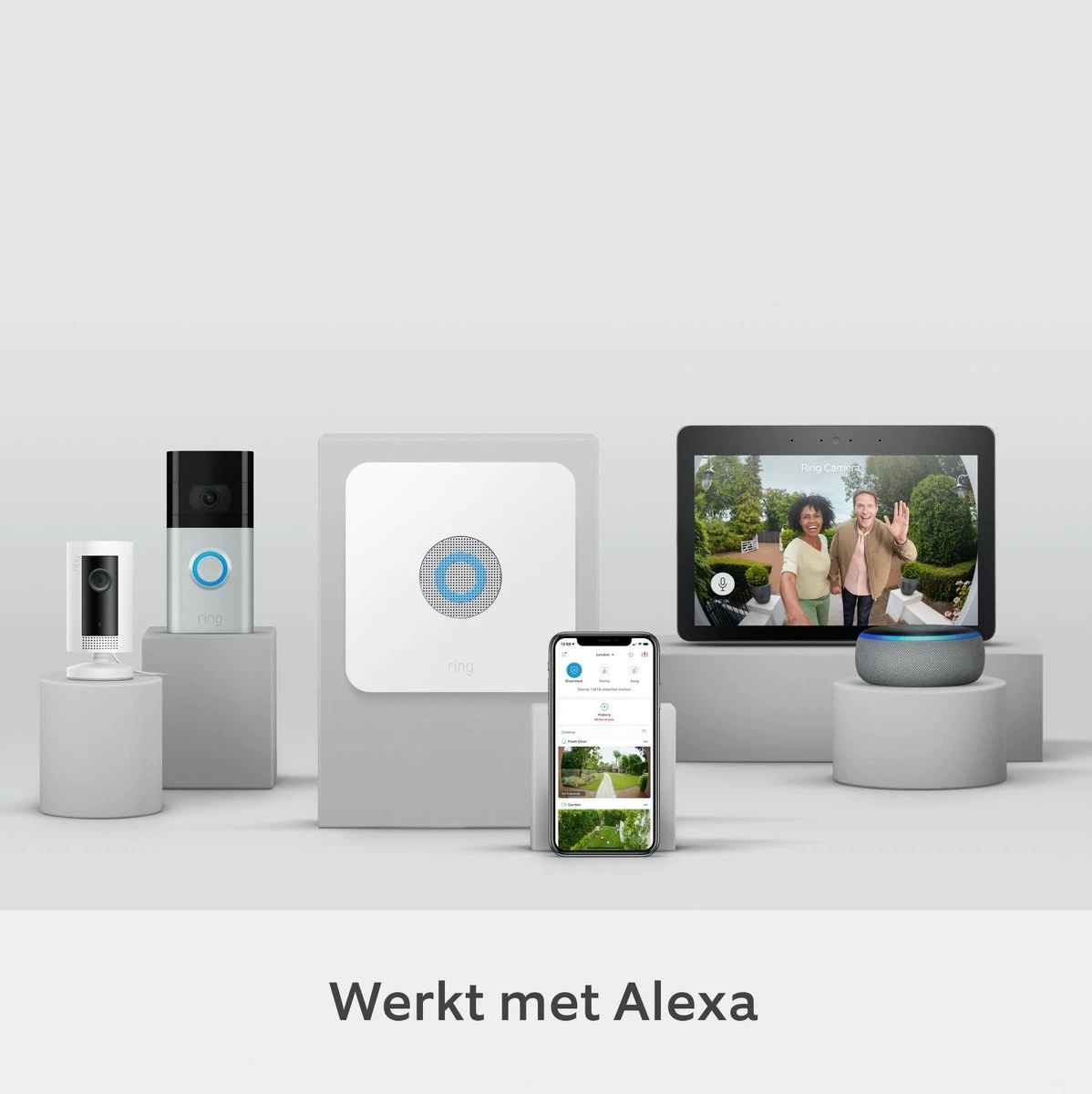 Koppel Ring Alarm aan de videodeurbellen en beveiligingscamera’s van Ring. Zorg daarbij voor integratie met geselecteerde Alexa-apparaten zodat je met je stem het Ring Alarm kunt in- en uitschakelen en de status ervan kunt controleren. De onderdelen van Ring Alarm werken allemaal met apparaten en accessoires van de 1ste en 2de generatie.