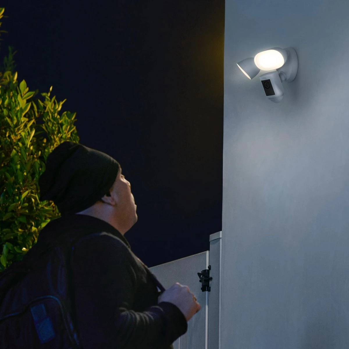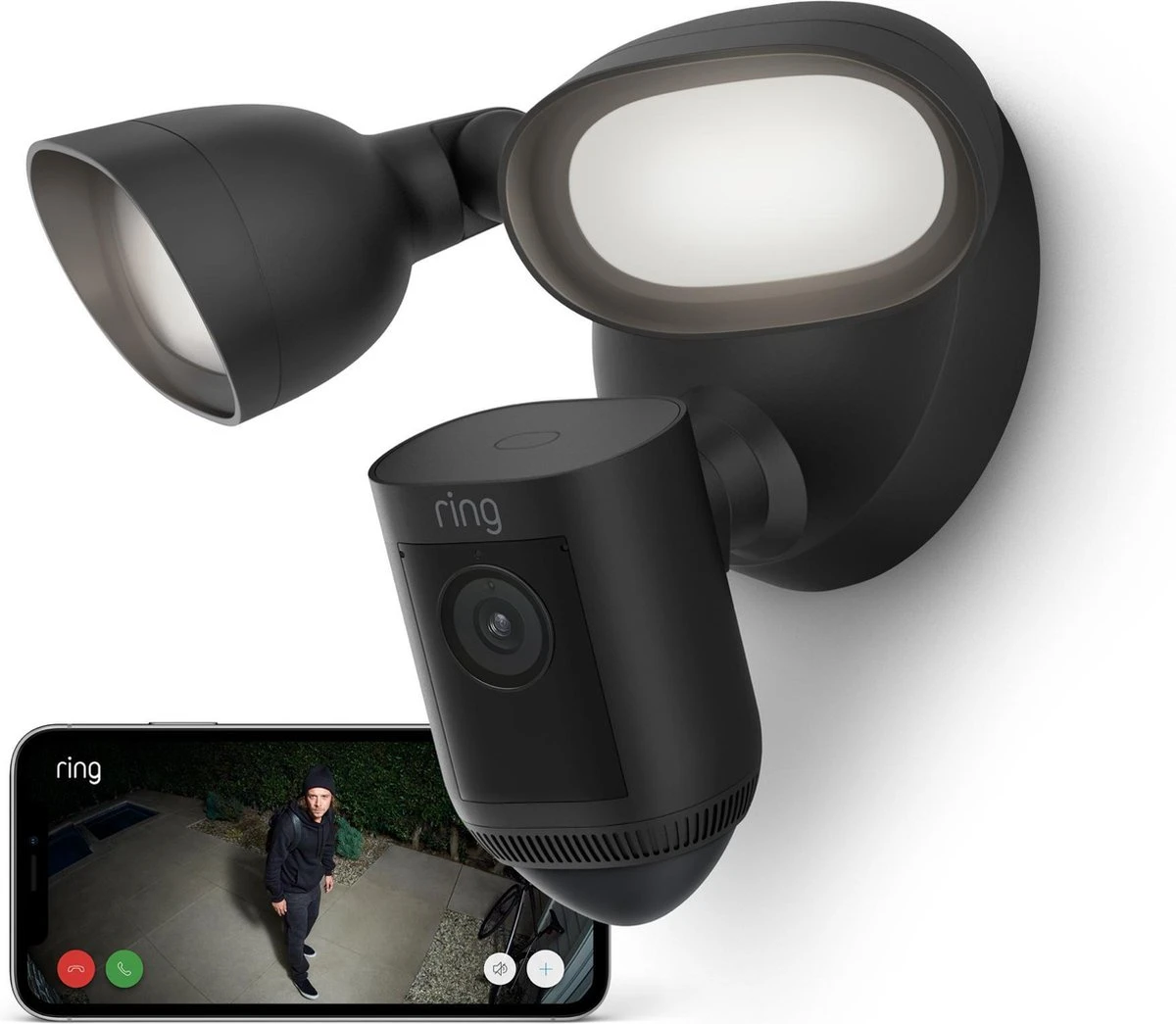 Activeer de ingebouwde schijnwerpers van 2000 lumen, pas naar wens de lichtsterkte aan, en laat de sirene afgaan in geval van nood. Je kunt alles bedienen vanuit de Ring-app.