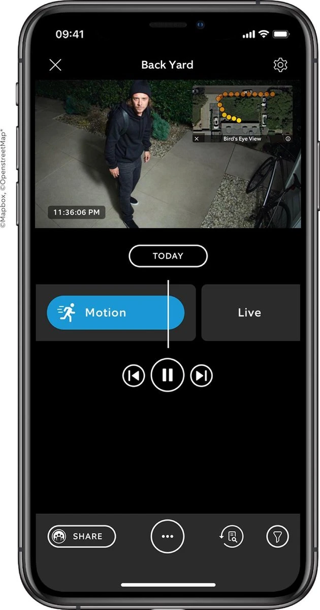 - Met 3D-bewegingsdetectie en zicht vanuit vogelperspectief kun je met een luchtkaartweergave zien wanneer en waar een bewegingsgebeurtenis is ontstaan.