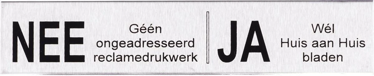 Wilt u geen reclame en folders meer ontvangen in uw brievenbus, dan kunt u een NEE-NEE-sticker of een NEE-JA brievenbus bordje / sticker op uw brievenbus plakken. Materiaal: RVS met plakstrip Formaat: 110x20x0,5 mm Geen verzendkosten! Tekst: nee geen ongeadresseerd reclamedrukwerk nee geen huis aan huis bladen