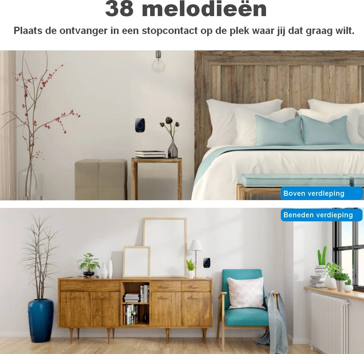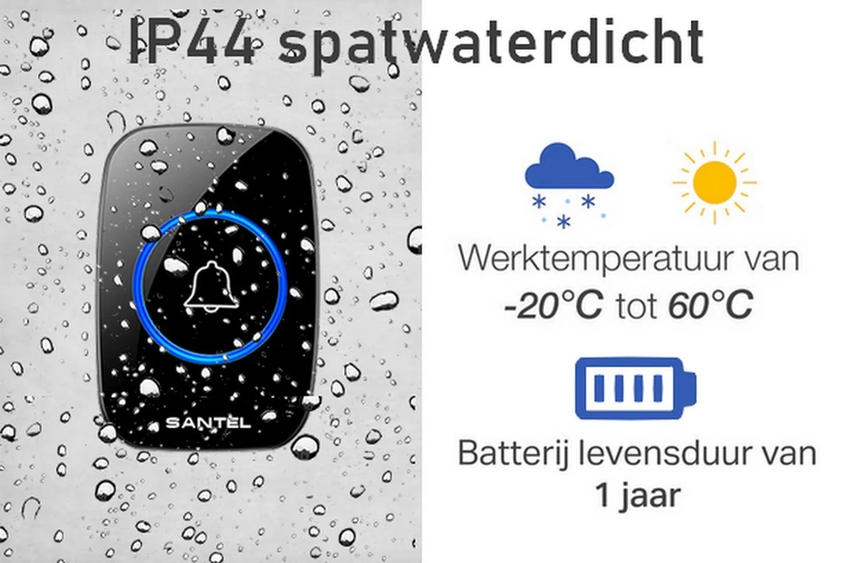 De deurbelset is volledig draadloos en tevens IP44 waterdicht. U kunt eenvoudig elk stopcontact inpluggen zoals u dat wilt en het speelt zijn eigen rol!