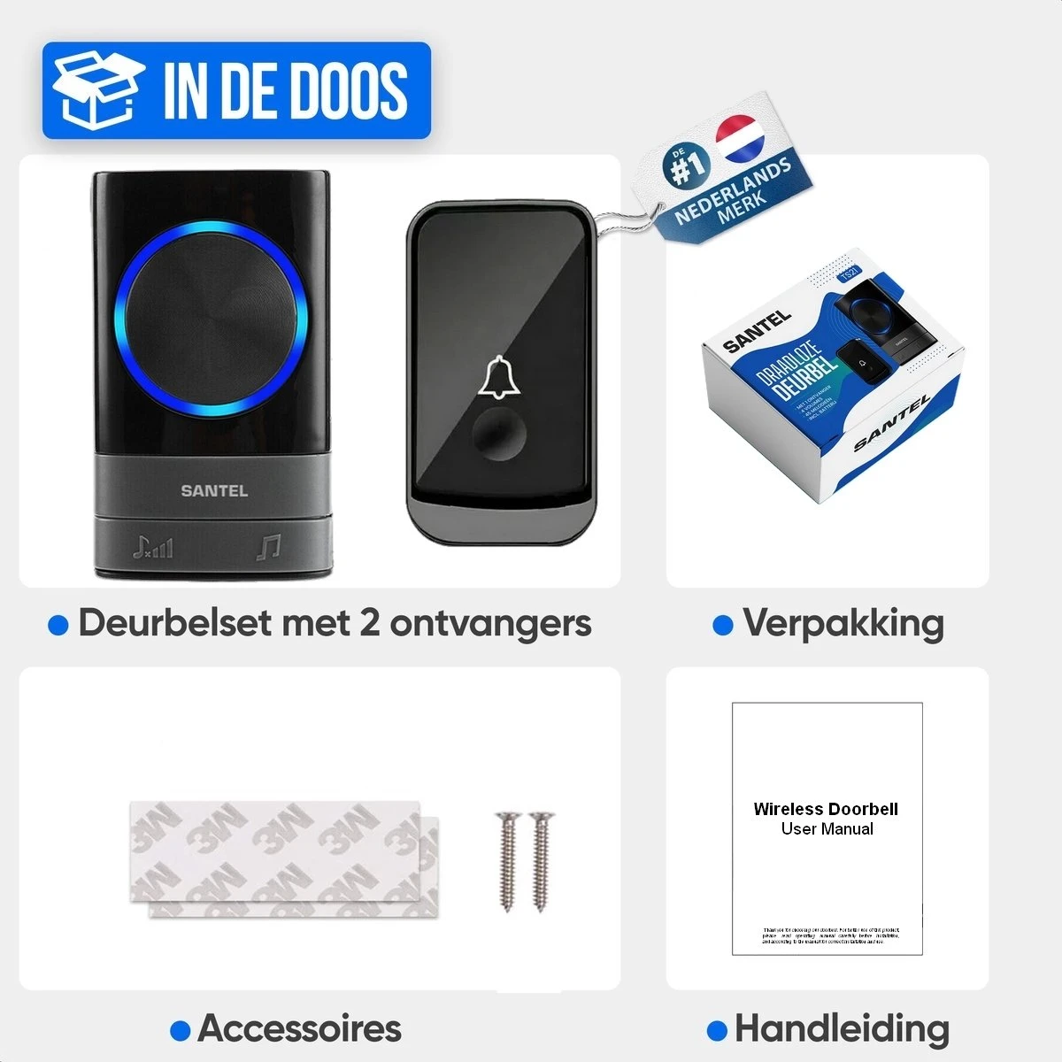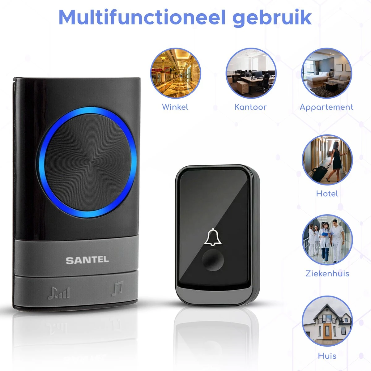 Santel deurbel werkt geheel draadloos en is daardoor makkelijk in gebruik te nemen. Het systeem maakt gebruik van een 100% storingsvrij digitaal signaal, waardoor de deurbel set ook in goed geïsoleerde nieuwbouw woningen feilloos werkt. In een open ruimte haalt dit signaal tot wel 300m, ruim voldoende dus om overal in huis te gebruiken.