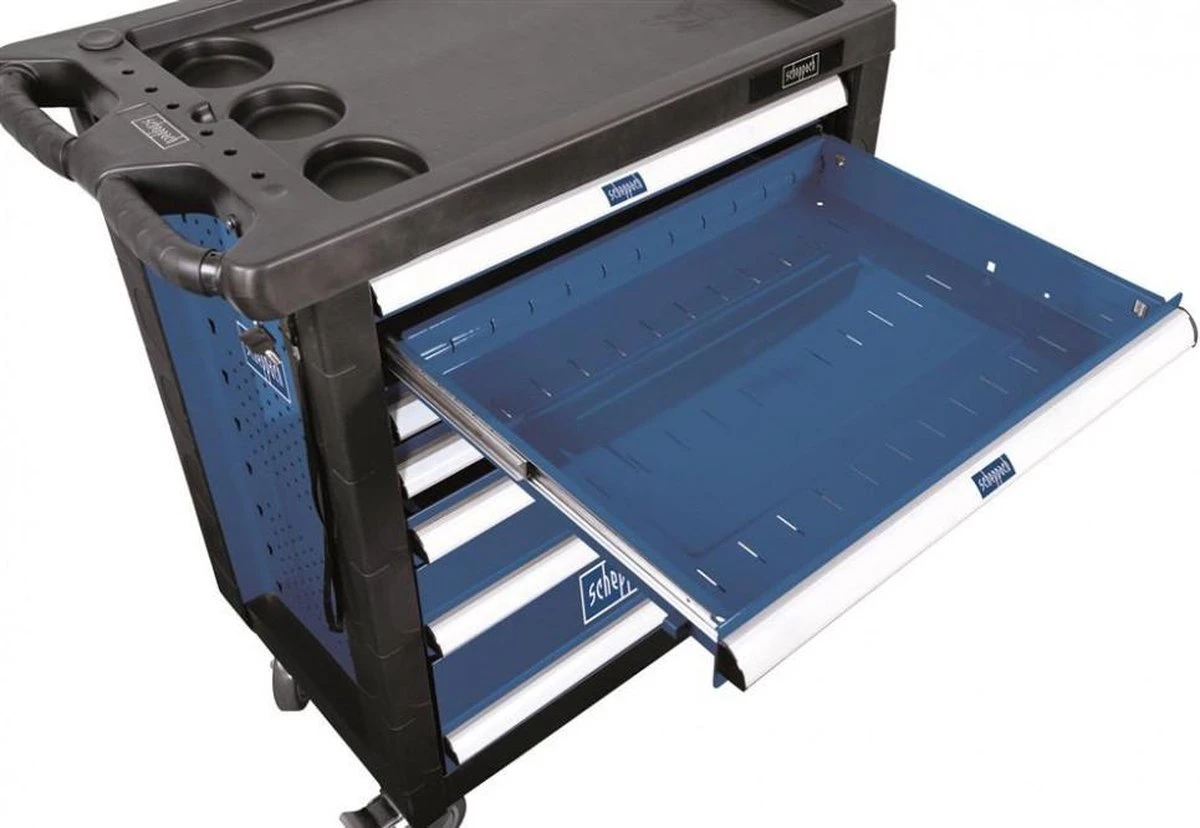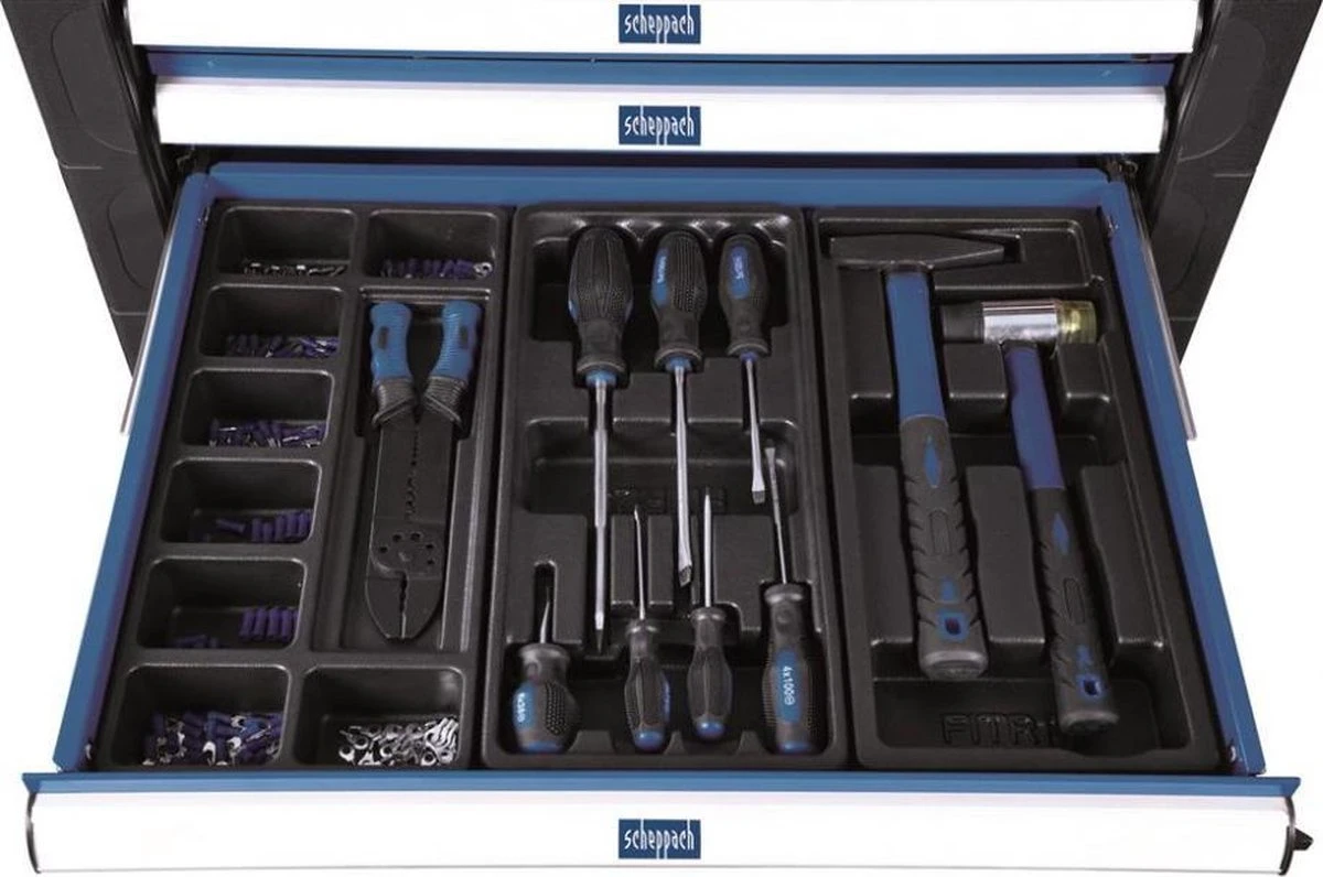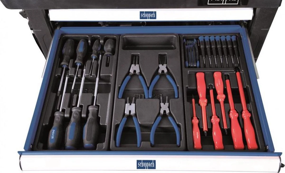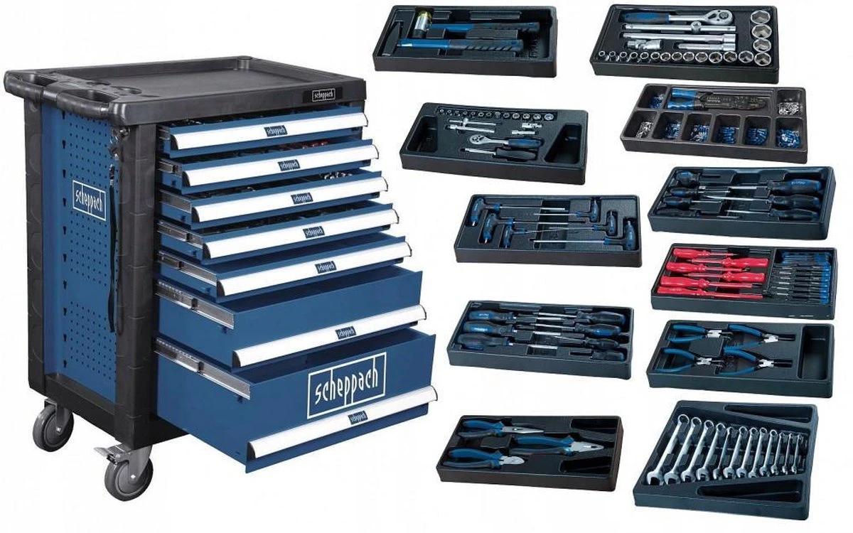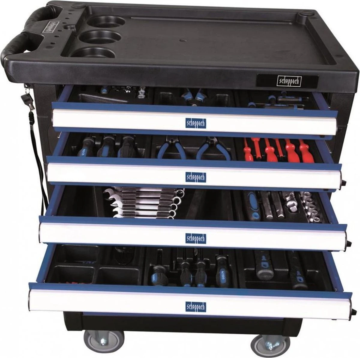 Altijd het juiste gereedschap bij de hand met deze complete gevulde gereedschapskar van Scheppach. De sterke en duurzame kar is uitgerust met een 263-delige gereedschapsset waarmee je alle kanten op kunt. Letterlijk, want door de 4 wielen -waarvan 2 zwenkwielen voor gemakkelijk draaien- verplaats je de wagen eenvoudig wanneer nodig. De wielen hebben een remstand voor wanneer je wil dat de kar op zijn plaats blijft staan.